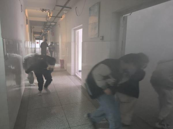 随后,学校开展消防疏散演练,演练以学生公寓发生火情为背景,由点燃烟雾弹、拉响消防警报、组织人员疏散、清点上报人数等环节组成。当消防警报响起之后,参加演习的全体师生按照疏散方案,用打湿的毛巾捂住口鼻,沿消防安全通道迅速有序地撤离至下沉音乐广场集合,并清点上报人数。