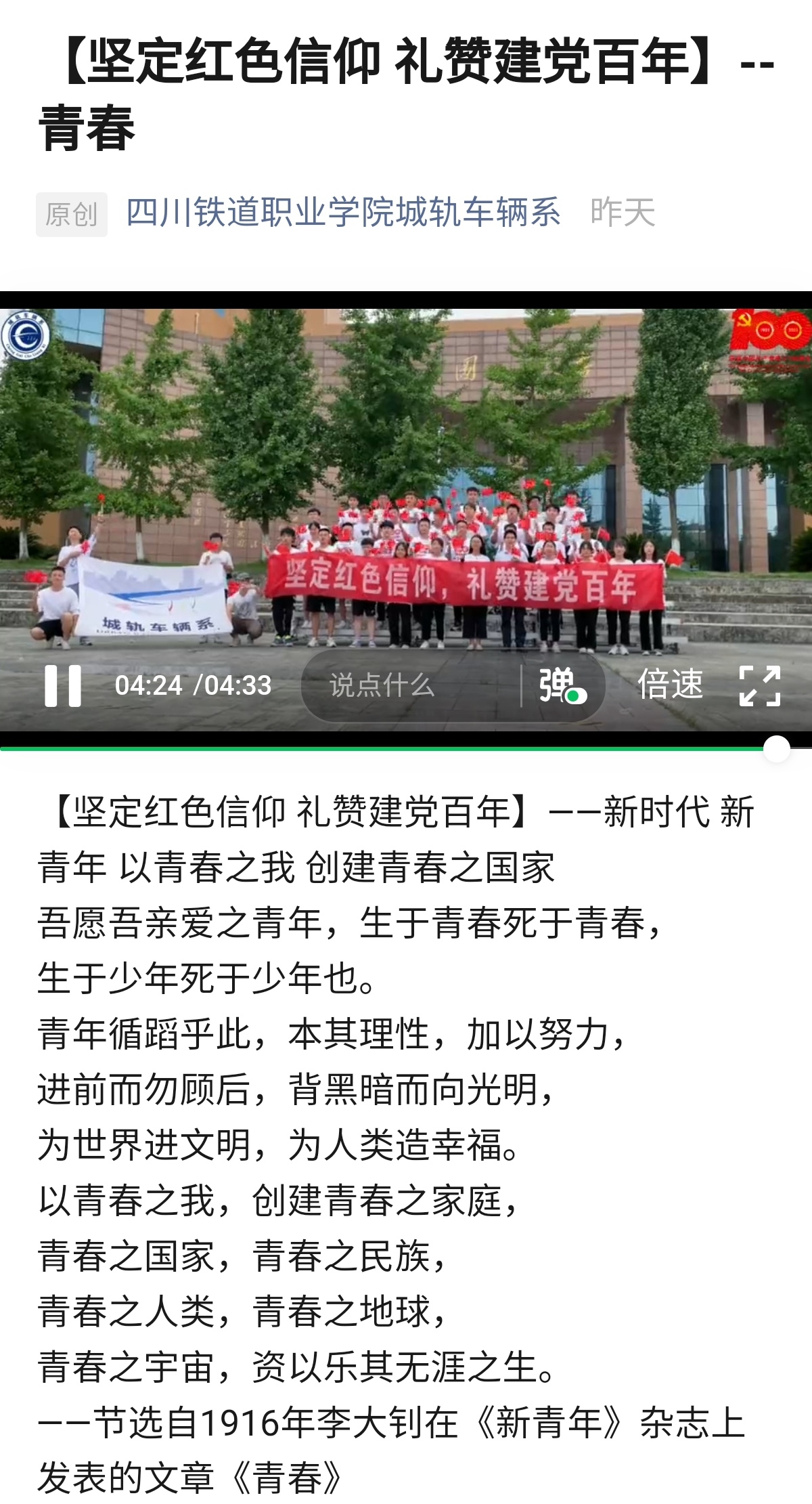 庆祝大会上,中共中央总书记、国家主席、中央军委主席习近平发表了重要讲话。我系师生在学院大礼堂、各班教室通过集中观看的形式共庆建党一百周年,师生们认真聆听了习总书记重要讲话,一边观看一边记录,大会结束后,我系师生还结合习近平总书记的讲话精神开展了线上讨论,分享了心得感悟,撰写了观后感。城轨车辆系19T2班沙孟飞同学表示:我们正面临世界百年未有之大变局。这是一个前所未有的新时代,一个伟大的时代,生逢其时,责任重大,在融入大变局、新时代的过程中发展自己、成就自己。城轨20T4班黄文会同学表示:百年风雨兼程,回顾史诗般的泪水;百年栉风沐雨,沉浸着无数先辈的鲜血。青山仍在,国兴民健;民气昂扬,万众一心;汉唐旧业,华夏新章;中华已兴,党业辉煌!吾辈青年,无问天命,不坠青云之志;吾辈青年,坚定信仰,砥砺前行。此外,我系学生会成员还拍摄、制作了《青春》宣传短片,为中国共产党100岁生日送上最诚挚的祝福。