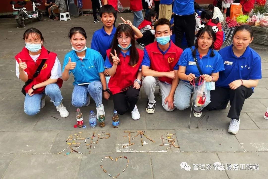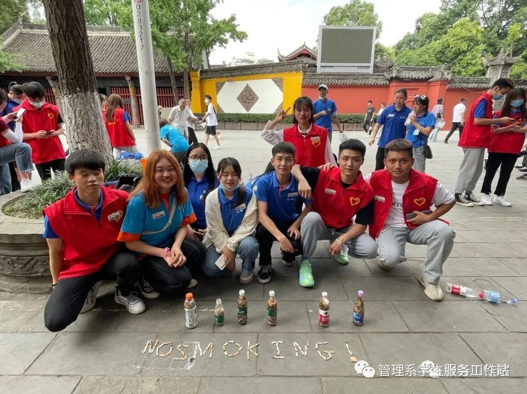 为提高我系学生环境保护意识,增进同学之间情感交流,了解我国红色历史文化。我系团总支在全系招募47名志愿者,于5月15日下午在青羊区文殊院开展了“爱成都,护环境,从我做起”的志愿服务活动。本次活动以文殊院为中心,要求所有志愿者清理文殊院社区周围区域的烟头、垃圾,并向周边游客宣传垃圾分类的相关知识,以培养青年勤劳、文明,爱环境的优秀品质,展现了当代青年思想的先进性、实践性。 本次活动在钟欣老师的带领下,分小组进行了时长两小时的环境清理活动。每个小组都在组长带领下认真进行环保工作,大家将空瓶子作为容器,用钳子和镊子捡拾地上的烟头和垃圾,大家在街道的每个角落仔细寻找,不偷闲、不懈怠。在活动结束后,各小组用收集的烟头进行了创意展示,并进行合照及录制相关视频,呼吁大家保护环境“爱成都、护环境、从我做起”。 通过此次活动,促进了同学之间的交流,提高了团结协作能力,在体验团队合作乐趣的同时培养学生的创造能力,增强集体的凝聚力,大家也更充分体会到保护环境的重要性。