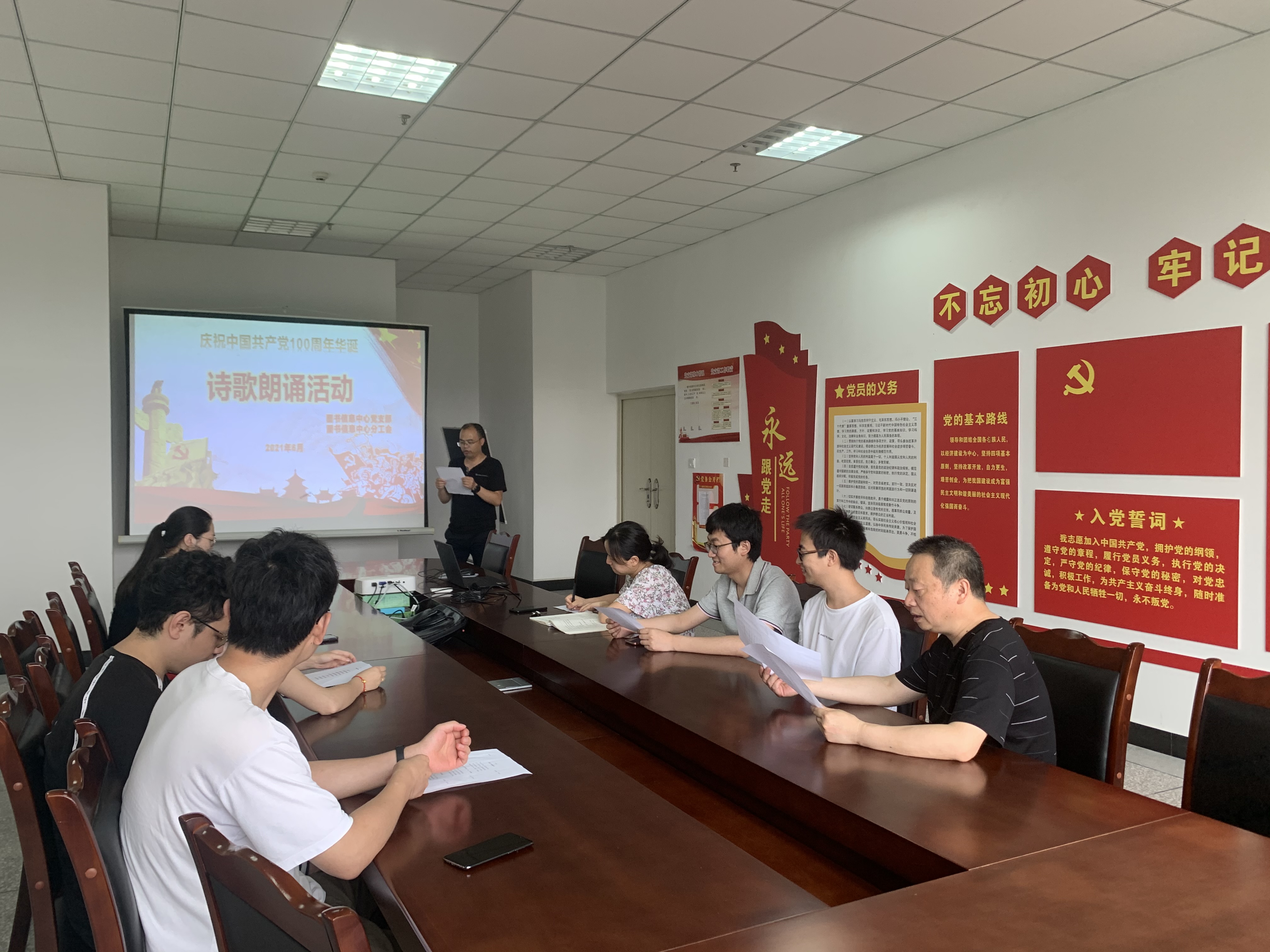 为庆祝中国共产党成立100周年,深入贯彻落实党的十九大、十九届五中全会,促进学习型环境建设,撒播新风正气,促进精神文明建设,激发广大教职工开拓奋进、建功立业的使命感和责任,6月16日,图书信息中心党支部联合图书信息中心分工会于图书馆三楼会议室成功开展“诗歌飘扬百年路,红船逐浪万里行”党史学习教育主题诗歌朗诵会。老师们均积极参加了此次活动,未能到活动现场的老师通过录制视频的方式参与。