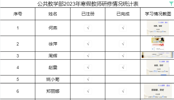 为深入学习贯彻党的二十大精神,服务教师终身学习、持续发展,按照《教育部办公厅关于开展2023年寒假教师研修的通知》要求,公共教学部于2023年1月—2月期间完成线上2023年“寒假教师研修”活动。 公共教学部教师在国家智慧教育公共服务平台学习2023年“寒假教师研修”专题,针对本专题的“学习宣传贯彻党的二十大精神”“教师直播教学安全培训”“师德典型引领”“教师关爱讲堂”“塑造‘双师型’教师”五门课程进行研修。本专题课程研修聚焦深入学习贯彻党的二十大精神,加强优秀教师典型的示范引领、强化对教师的关心关爱、提升教师综合育人能力和保障教师直播教学安全等主题。部门全体教师通过实名注册,进入专题学习,均完成教师培训学时,获得电子学习证书。 公共教学部将以党的二十大精神为指导,理解专家、二十大代表对党的二十大精神的解读思路,努力将二十大精神融入教育教学中;以教育楷模为引领,体会2022年全国教书育人楷模的事迹,潜心扎根教育事业;以教师赋能为契机,思考“双师型”建设的重要性和必要性,塑造“双师型”教师,加强师资队伍建设;以网络教学问题为重点,筑牢安全教育防线。