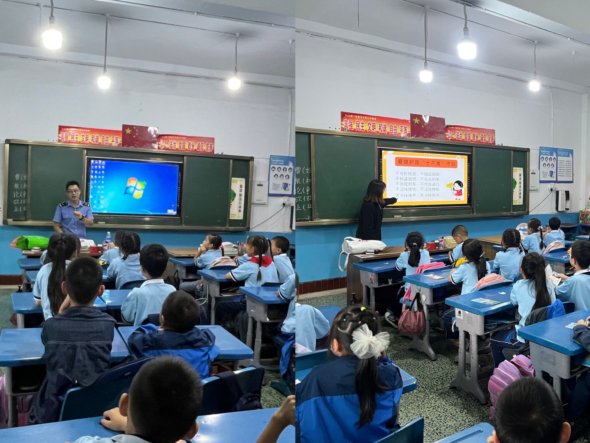 本次活动主题围绕“知路、爱路、护路”进行安全教育。“铁小川”志愿团队面对热情、纯真的二年级小朋友主要从不文明乘车行为、随意摆放障碍物、破坏铁路设施设备以及攀爬铁路车辆和通信电杆等危险行为展开铁路安全知识科普。通过“铁小川”铁路沿线真实案列讲解与动漫视频相结合的方式,让小朋友们参与其中,学习到了如何安全文明乘坐高铁;认识到了铁路安全的重要性;并愿意参与到宣传维护铁路安全中去。最后全体同学在“铁小川”的带领下进行争做“爱路、护路”小卫士宣誓,承诺认真学习铁路安全知识,积极向同学和家人宣传铁路运输安全知识,勇于制止和举报破坏铁路的不法行为,用实际行动确保自己的人身安全,确保铁路的安全通畅。林军和新兴学校教师代表在本次活动后结束后给予4名“铁小川”志愿者高度评价。