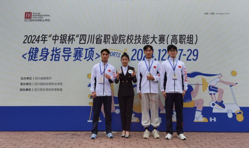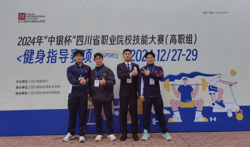 12月29日,由四川省教育厅主办的2024年“中银杯”四川省职业院校技能大赛(高职组)健身指导赛项在四川国际标榜职业学院落下帷幕。来自全省30所高校,51支代表队参加比赛,beat365官网首次选派的2支学生代表队分获二等奖和三等奖。 本项比赛内容包括健身运动处方设计与实施、体能竞赛和岗位知识与能力竞赛。在公共教学部体育教师杨刚和谭永胜的精心指导下,参赛队员认真学习相关理论知识、不断强化体能训练,赛场上沉着应战、团结协作,针对性设计并实施运动处方,最终凭借出色的表现赢得赞誉。