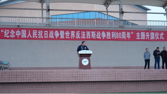 随后,铁道工电学院党总支王立发言,他指出同学们必须铭记历史、珍爱和平,继承先烈遗志,在和平与发展的道路上坚定前行,以卓越的成就告慰历史,照亮未来。他还强调同学们要将抗战精神融入个人学习,树立技能报国、技能强国的决心,要努力把所学的理论知识、技能转化为国家发展的实际力量。同时,他也鼓励新生勇于面对学习中的困难,扎实掌握专业技能。同时针对当前学生过度依赖AI工具的现象,王立倡议大家每天坚持1小时纸质阅读,每年至少阅读5本书,通过系统阅读构建完整知识体系,提升思辨能力。