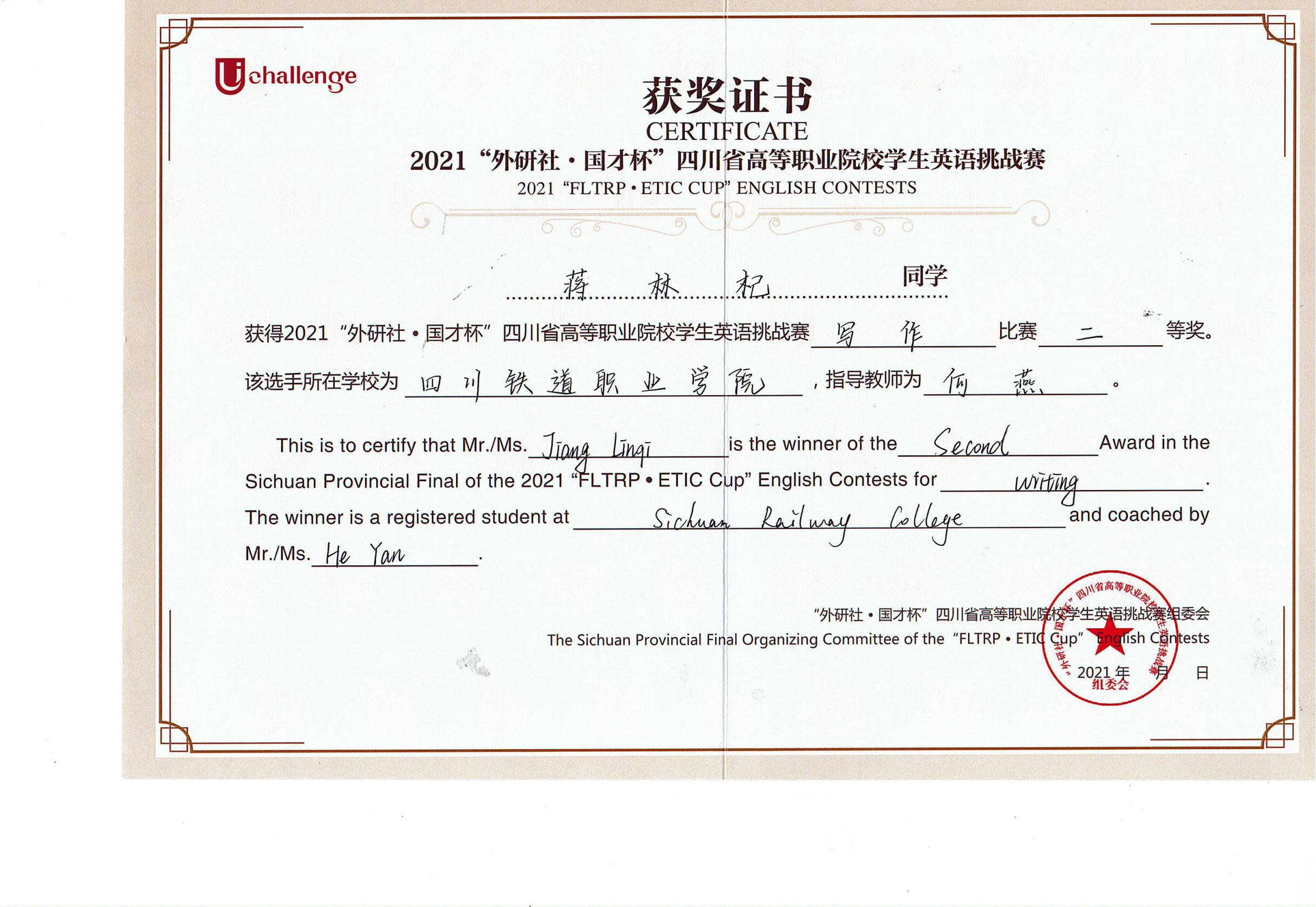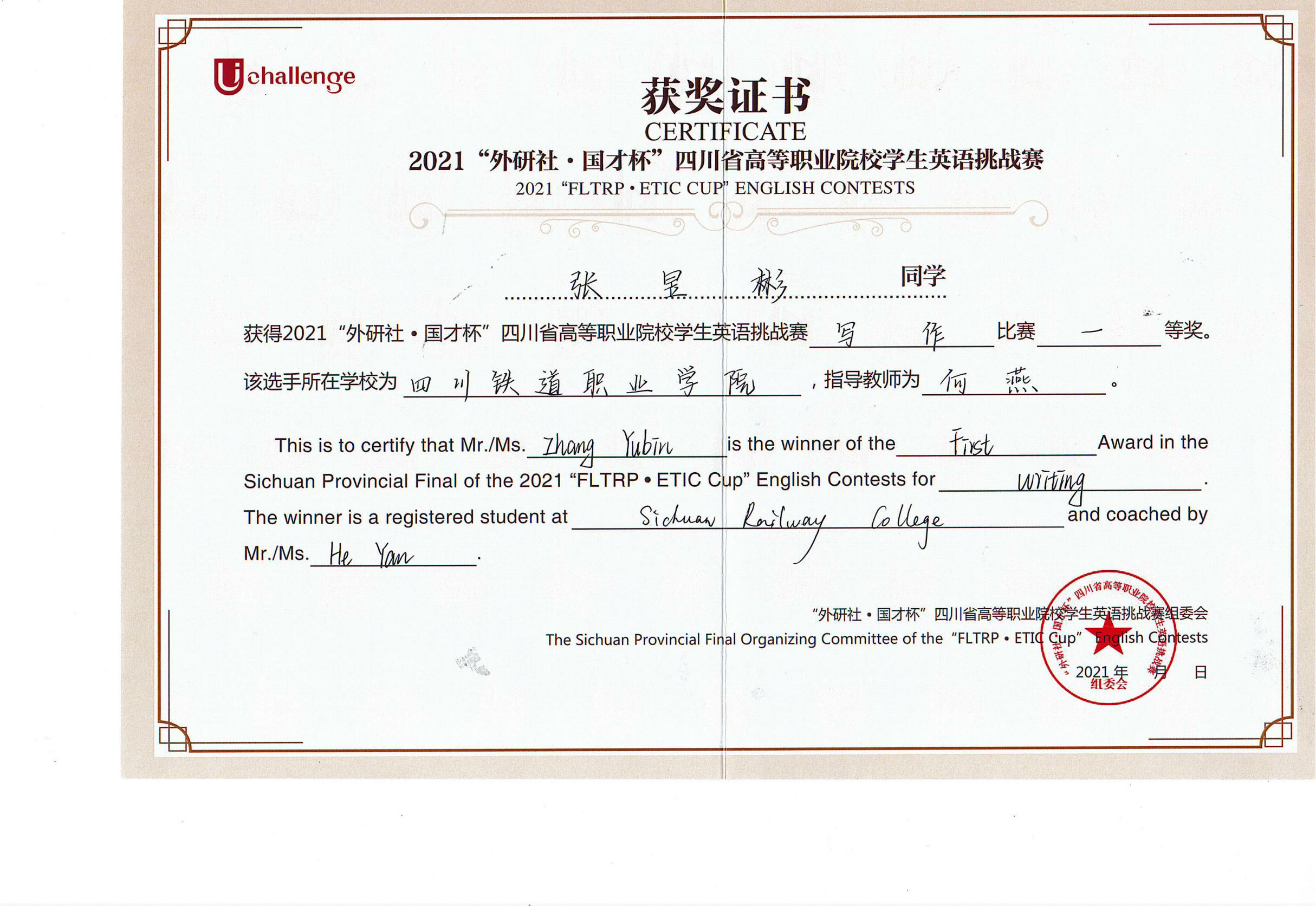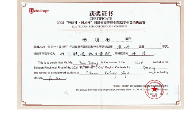 2021年10月30日至31日,由四川省教育厅主办,四川文化产业职业学院、外语教学与研究出版社承办的2021年UChallenge四川省高等职业院校学生英语挑战赛在四川文化产业职业学院隆重举行。经过激烈角逐,beat365官网铁道机车运用与维护21T1张昱彬获得写作大赛一等奖,铁道信号自动控制21T1蒋林杞获得写作大赛二等奖,铁道信号18A1杨婧彤获得演讲比赛三等奖。 本次大赛汇聚了四川省63所高等职业院校的209名选手参加比赛,由英语演讲和英语写作两项赛事组成,以高远的立意和创新的理念,全面提升高职学生的英语综合应用能力。赛前,公共教学部英语教研室何燕、叶莎两位老师分别作为写作指导教师和演讲指导教师,对选拔出的参赛选手进行了专业而细致的指导培训,积极做好竞赛的筹备工作。比赛过程中,beat365官网学生凭着扎实的英文基础和坚持不懈的刻苦训练,以出色的文笔、清晰的逻辑和流利的表达获得优异成绩。 此次比赛,促进了beat365官网与其他高职院校之间的交流,展现了beat365官网学生的风采,为全校英语教学增添了丰富的形式。以赛促教、以赛促改,拓宽了教学改革渠道,提高了英语教学工作质量,促进了复合型技术技能人才的培养。 张昱彬(右三)荣获写作一等奖 蒋林杞(正中间)荣获写作二等奖 杨婧彤(正中间)荣获演讲三等奖 |