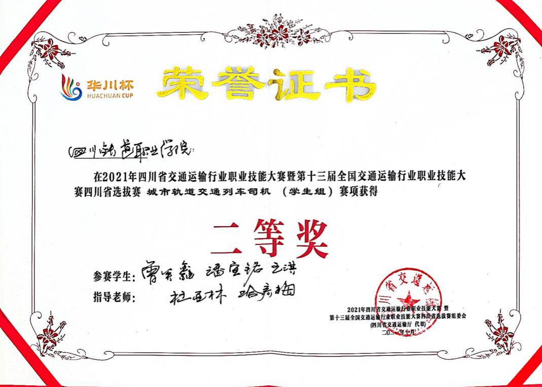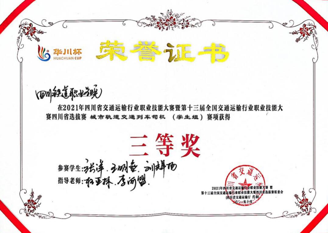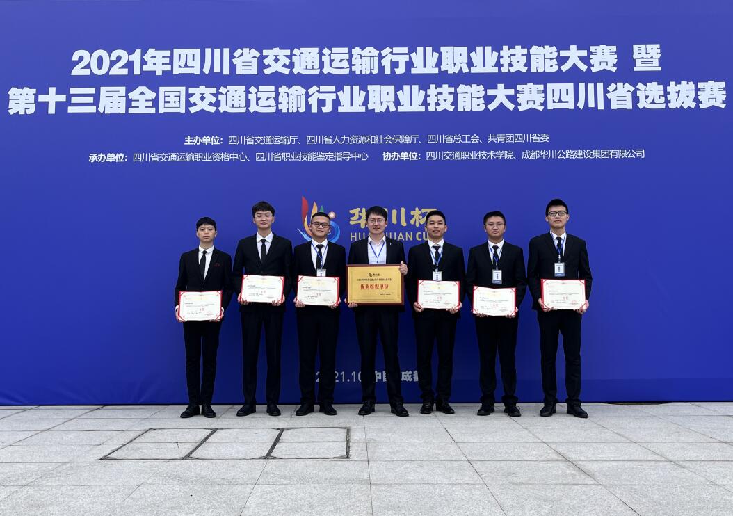 为大力弘扬劳模精神、劳动精神、工匠精神,10月29日,2021年四川省交通运输行业职业技能大赛暨第十三届全国交通运输行业职业技能大赛“华川杯”四川省选拔赛圆满落幕。beat365官网城市轨道交通学院6名学生参加城市轨道交通列车司机(学生组)赛项,与省内18支参赛队激烈比拼。最终,beat365官网学生组一队(王淇、曾关鑫、潘宣铭)获省赛二等奖,学生组二队(张洋、王明垒、刘辉扬)获省赛三等奖。学校荣获优秀组织奖,并获国赛参赛资格。