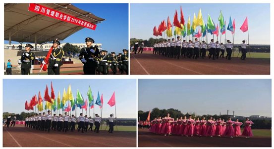10月31日上午8点20分,四川管理职业学院2018年运动会在成都校区田径运动场正式拉开帷幕。学院全体领导出席开幕式,各部门、各系(部)的负责人,全体师生参加了开幕式。 金秋送爽,丹桂飘香。开幕式上,各方队伴随着《运动员进行曲》庄严入场。随后,各院系的104个班级代表队高举院旗,高呼院训,喊着嘹亮的口号,怀着坚定的信念,迈着整齐的步伐,进入会场。这期间,各院系都派出了节目表演队,为本次比赛加油助威,彰显了青春活力。 图1 国旗护卫队、彩旗队、鲜花队、青年志愿者方队入场 图2 教工队和各系部入场 图3 各系部文艺表演 院长周立同志致开幕词。他代表学院对运动会的顺利召开表示热烈地祝贺。他讲到,党的十八大以来,以习近平同志为核心的党中央高度重视、关心体育工作,亲自谋划推动体育事业改革发展,将全民健身上升为国家战略,推动全民健身和个人健康的深度融合。总书记就体育事业发展作出重要批示,并指出“体育强中国强,推动我国体育事业不断发展是中华民族伟大复兴事业的重要组成部分”。他希望参赛运动员顽强拼搏、公平竞争、赛出风格、赛出水平、赛出友谊,并预祝本次运动会取得圆满成功。 随后,铁道通信信号15A1班苏雨婷代表运动员宣誓,体育教师杨刚同志代表裁判员宣誓。院党委书记李青锋同志宣布四川管理职业学院2018年秋季运动会开幕。