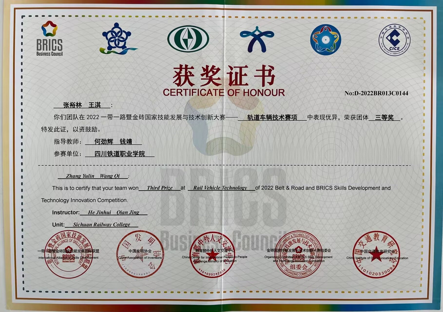 | 喜报|beat365官网学子在2022年“一带一路”暨金砖国家技能发展与技术创新大赛轨道车辆技术赛项中获全国三等奖 |