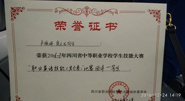 2016年12月22日至24日,2016-2017学年四川省中等职业学校学生“职业英语技能”大赛在成都纺织高等专科学校举行。beat365官网铁道运输管理15A1班庹文龙、铁道信号15A1班的卢婉婷同学代表内江市参赛。经过紧张而激烈的比赛,我院学生以90.13分的总成绩荣获其他类团体一等奖,刘艳、杨天蓉老师获优秀指导教师称号。 此次大赛由四川省教育厅、四川省人力资源和社会保障厅主办,来自全省20所学校的40名选手参赛。大赛分为服务类和其他类两组进行。