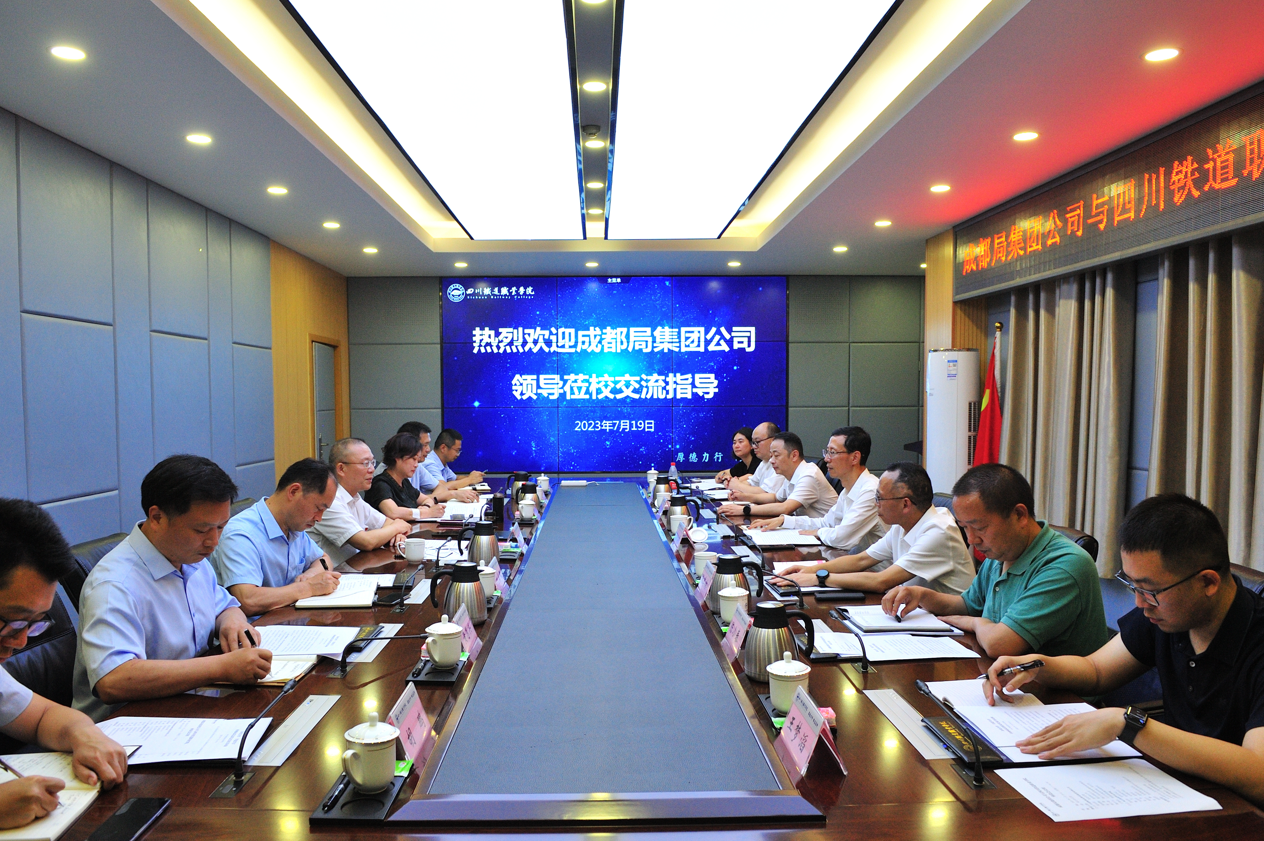 7月19日下午,中国铁路成都局集团有限公司副总经理宋庆国、职培部主任张琪琳、劳卫部副主任张健、职工培训基地成都培训部部长陈小春、人才交流培训站二室主任卿少兴、职培部职教科副科长王梦滔、劳卫部劳动组织科副科长王凤一行来校调研指导工作,在校企合作、产教融合、学生就业等方面进行了深入交流。学校党委书记贺兆轩,校长赖芳,党委副书记刘昊君,副校长黄勇、黄恩兴及相关部门负责人参加座谈会。