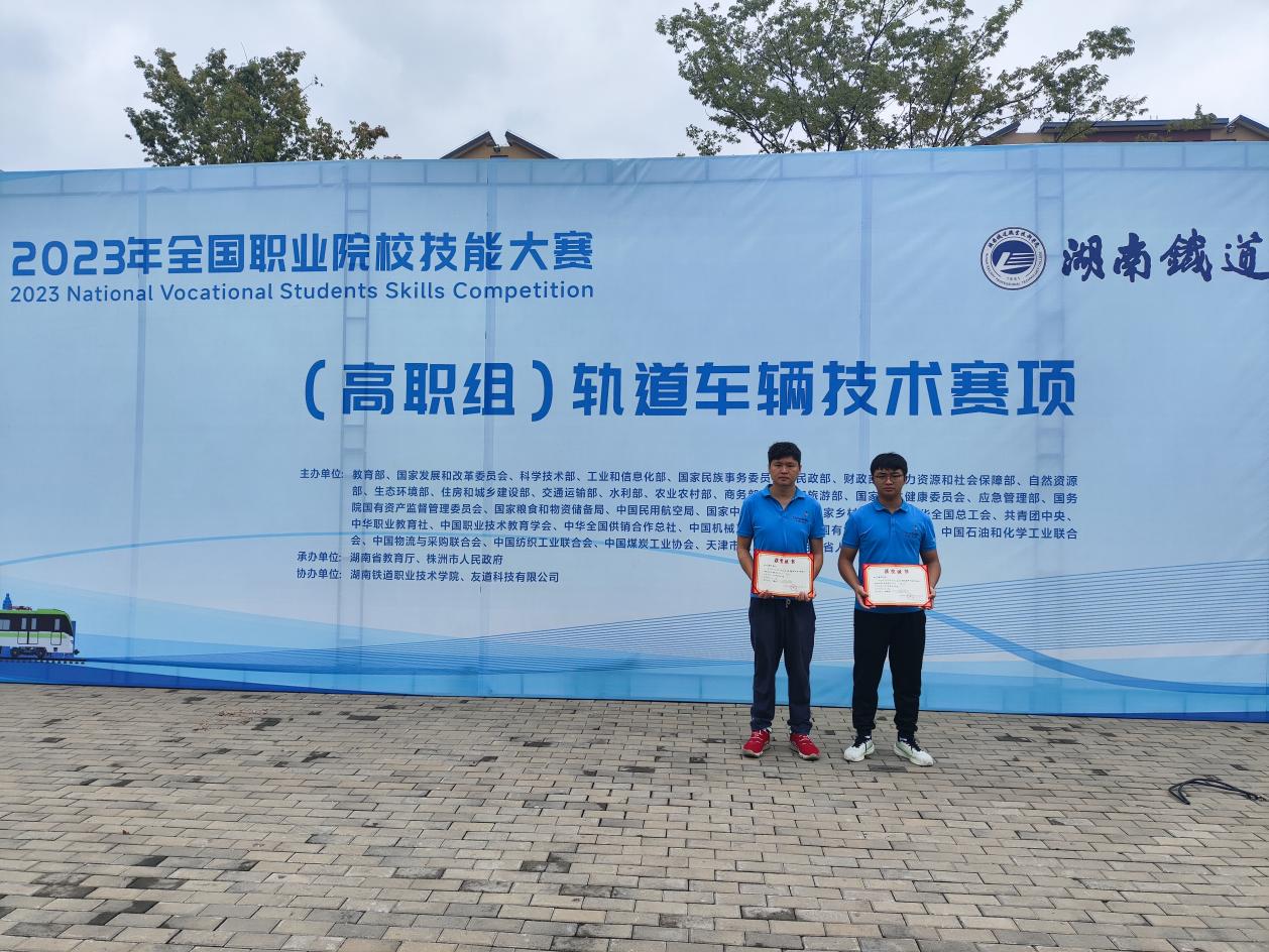 2023年全国职业院校技能大赛(高职组)轨道车辆技术赛项于8月25日—28日在湖南铁道职业技术学院举办,来自全国27个省市自治区的50所高职院校参赛,经过两天的激烈角逐,由城市轨道交通学院教师何劲辉、学生王炎组成的学校代表队荣获三等奖。