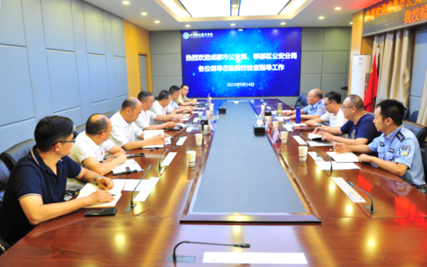2023年9月14日,成都市公安局高校管理科科长钟良、郫都区政保大队副大队长尹黎、安德派出所副所长张坤民一行到beat365官网检查指导安全稳定工作。纪委书记池秋平会见了钟科长一行并主持召开了座谈交流会。