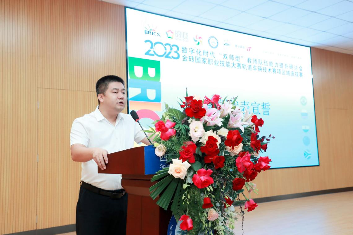 参赛选手代表宣誓 在热烈的掌声中,刘昊君宣布2023金砖国家职业技能大赛轨道车辆技术赛项区域选拔赛正式开幕。