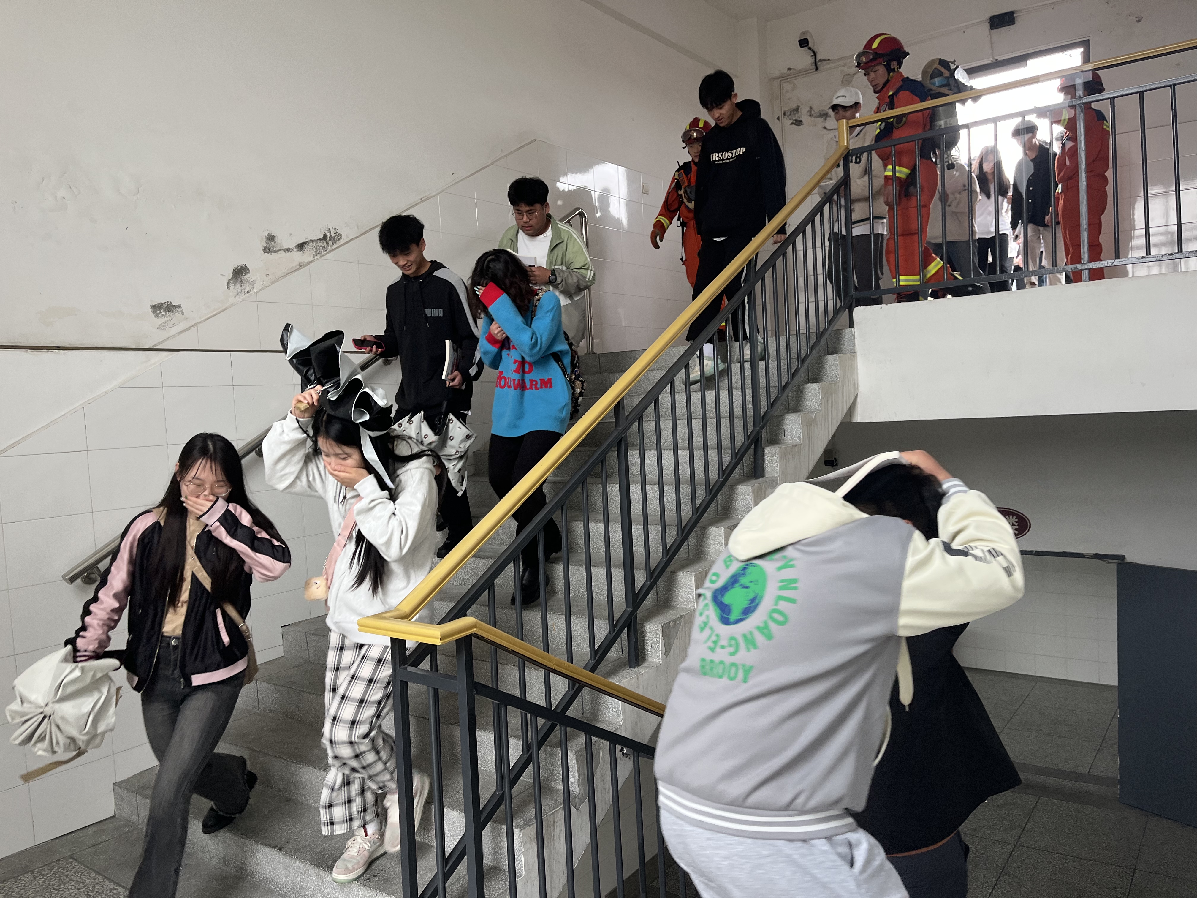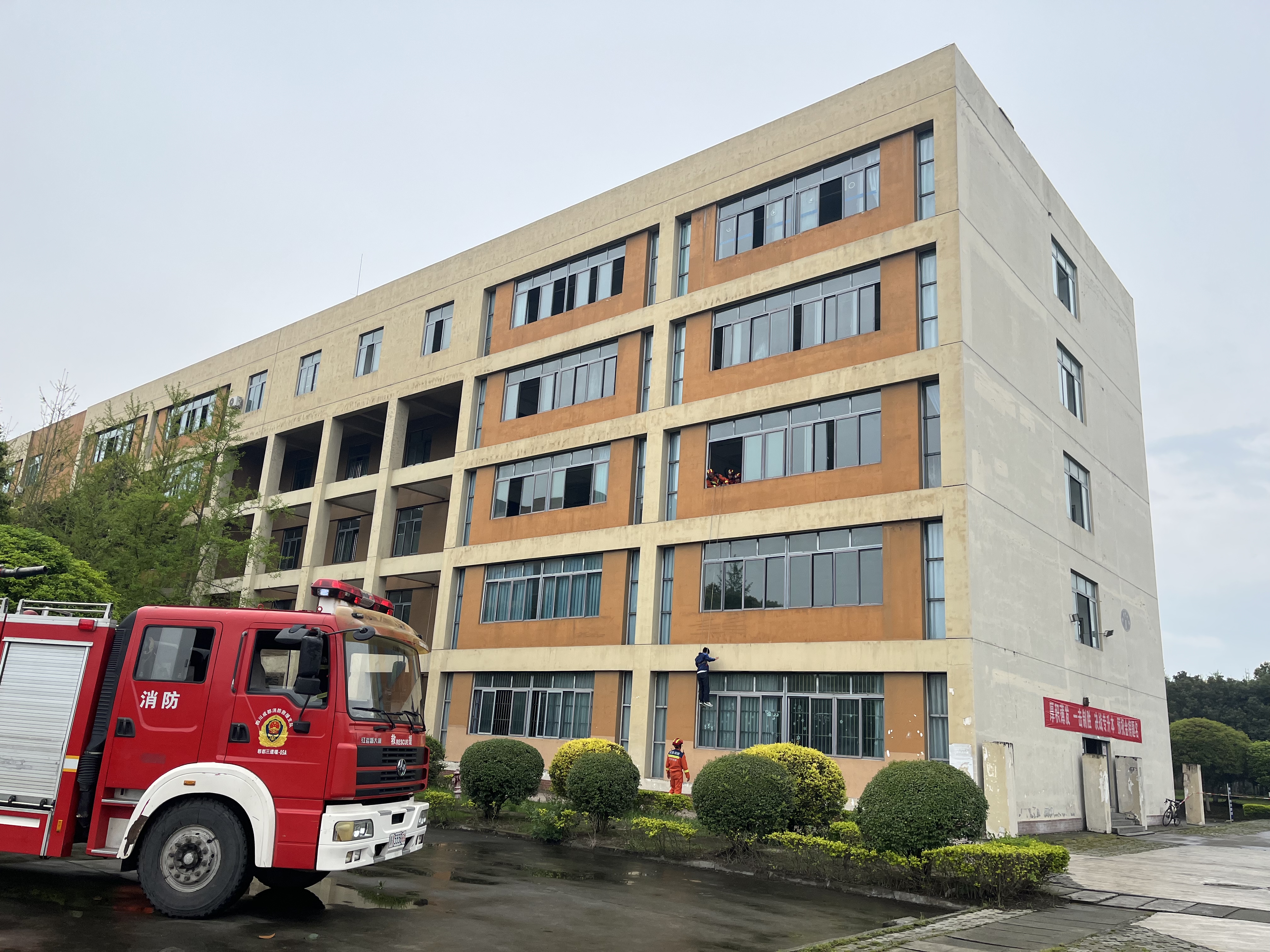 (利用消防索降绳解救被困学生) 15:38,消防安全应急疏散演练正式开始。演练由第一发现人报警、启动预案、拉响警报、疏散撤离、停电处置、火灾扑救、消防救援、清点人数和演练总结等构成。消防警报响起后,相关部门迅速按预案组织人员到达指定位置,按照疏散示意图及应急出口,引导师生有序疏散至田径运动场集中。15:45,安德消防中队接警后到达着火现场,消防队员兵分三路实施救援,第一路消防员利用消防索降绳将2名被困学生从3楼窗口解救到地面,第二路消防员赶往3楼着火点进行灭火,第三路消防员引导救援5楼被困人员。15:50,学生处和人事处组织清点师生人数,现场灭火与应急疏散工作顺利完成。