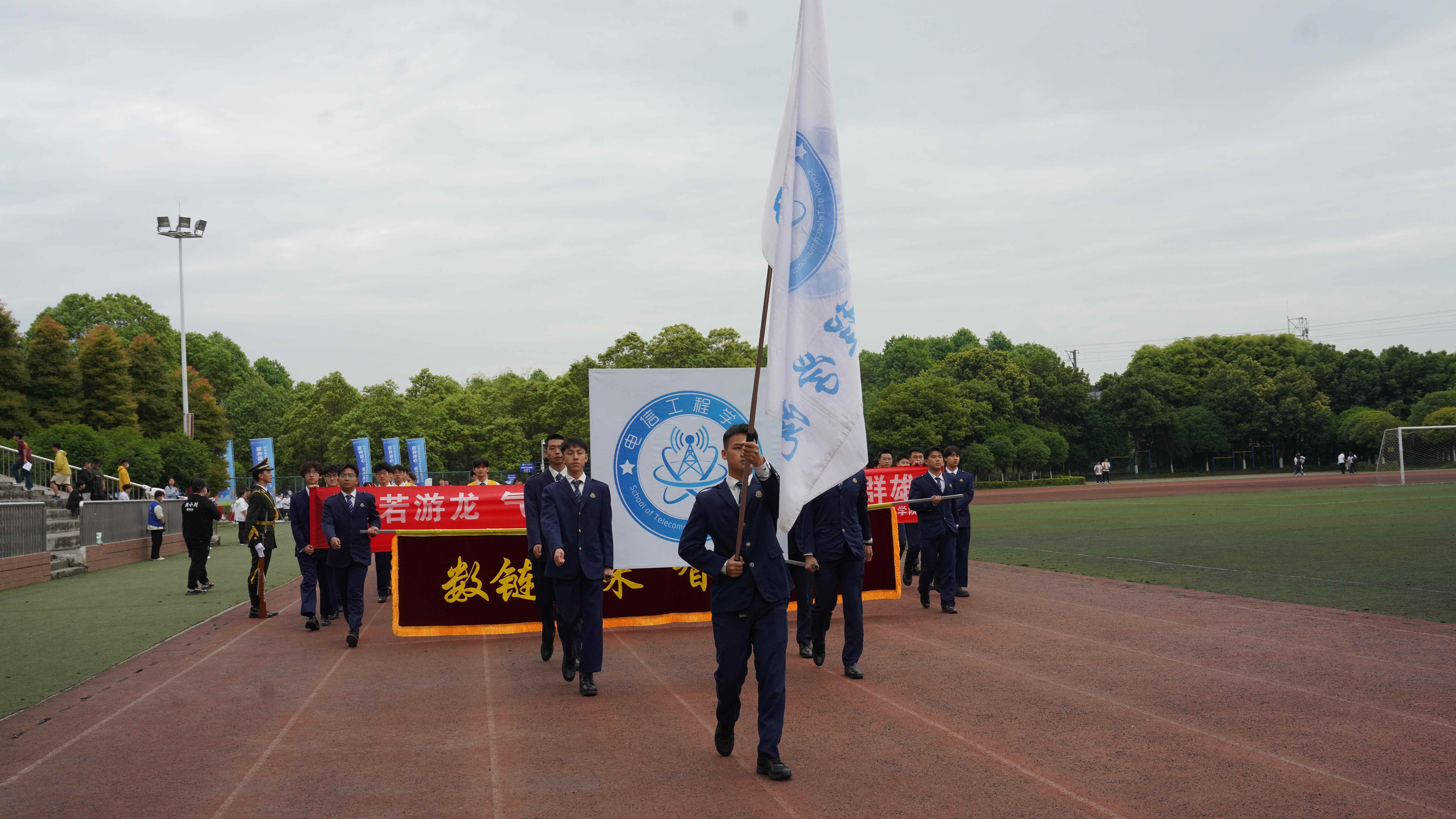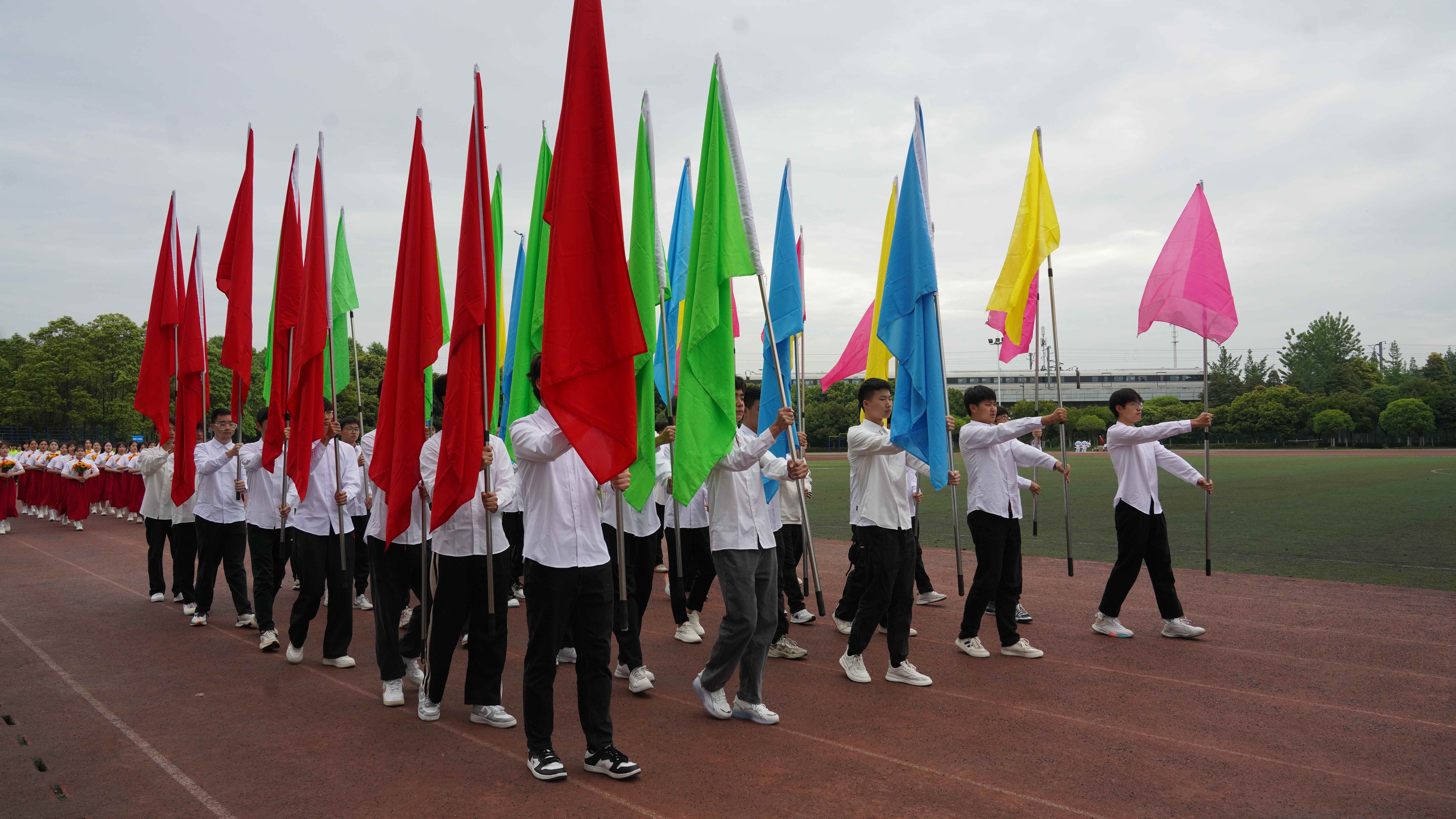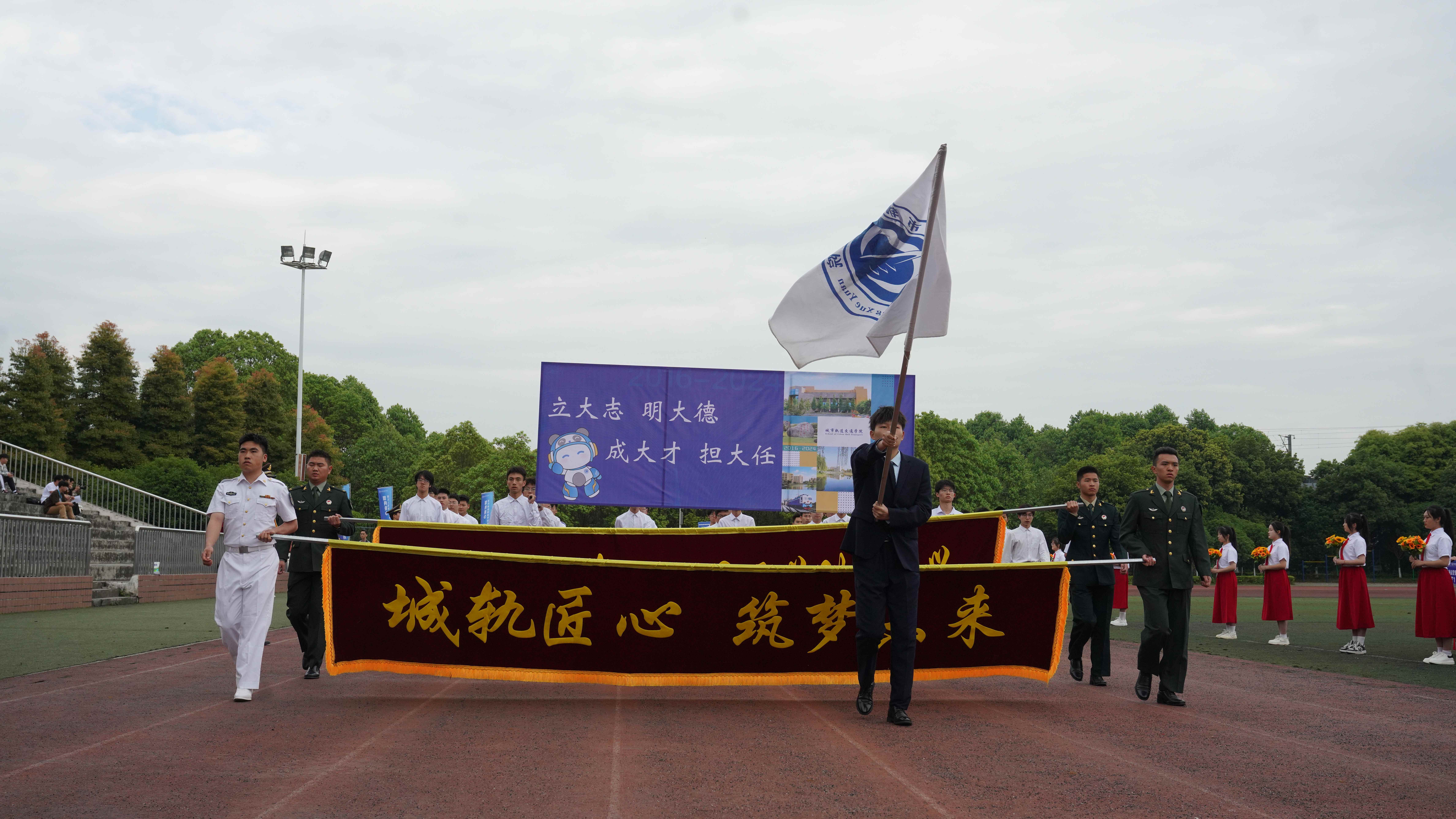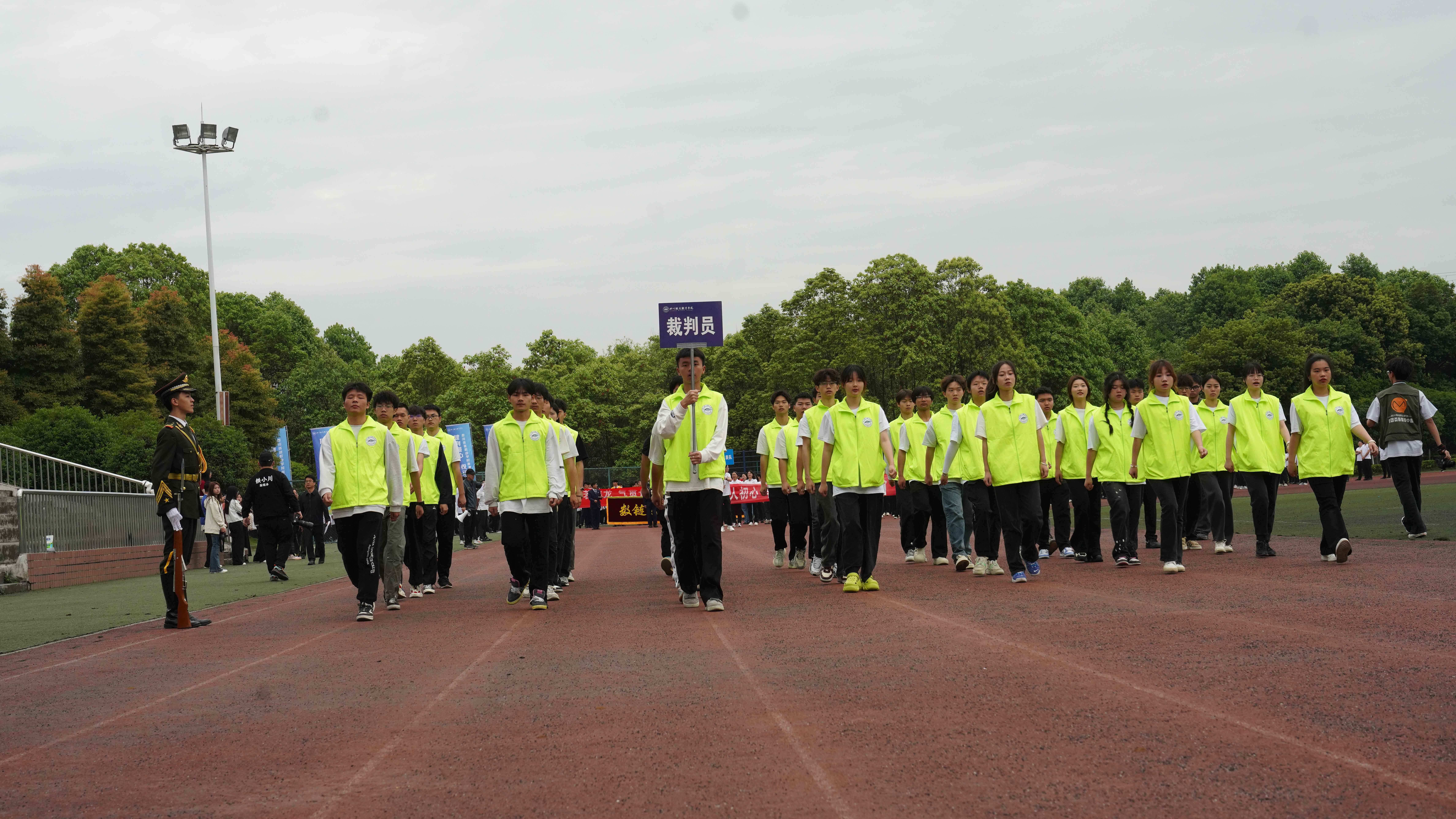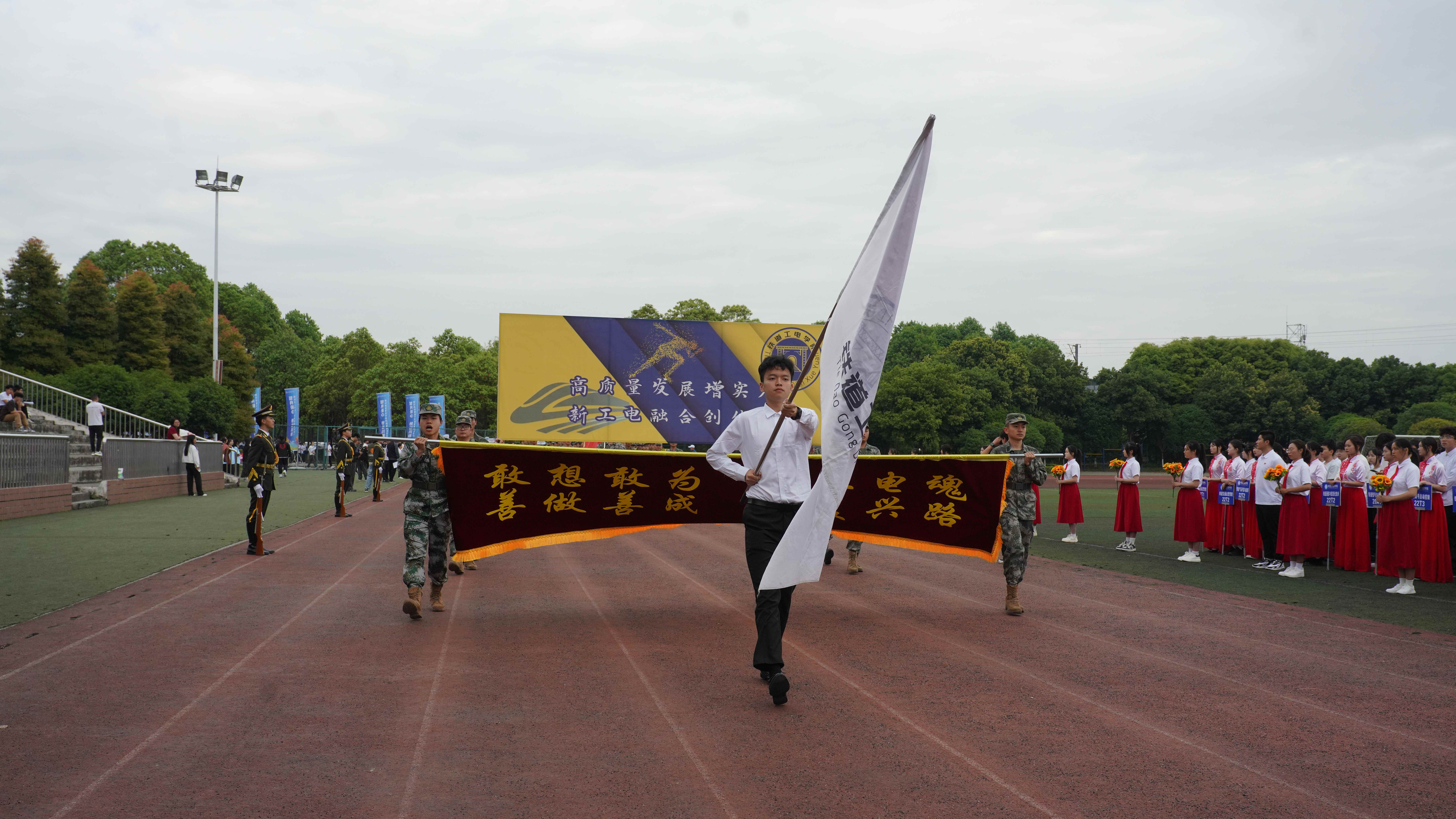 为贯彻落实习近平总书记关于加强学校体育工作的指示精神,教育引导师生树牢健康第一的理念,推动青年学生文化学习和体育锻炼协调发展,4月24日,学校隆重举办2024年体育文化节运动会,全校师生齐聚田径场参加开幕式。 上午八点三十分,开幕式正式开始。英姿飒爽的国旗护卫队、色彩绚烂的彩旗队、青春活力的鲜花队、气宇轩昂的裁判员队、教职工代表队和各学院学生代表队迈着整齐的步伐有序进场,展现了川铁师生青春洋溢、昂扬奋进的精神风貌。各方队入场后举行了升国旗仪式,全校师生齐唱《国歌》,以激昂的歌声表达对祖国的热爱之情。