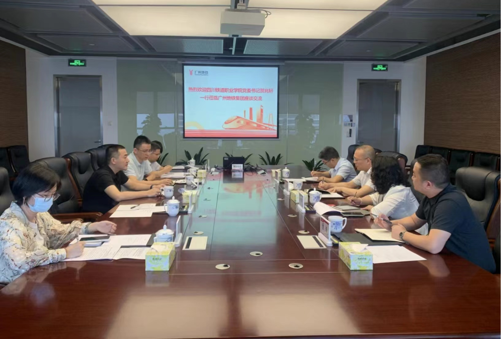 图2 党委书记贺兆轩带队来到佛山市地铁运营有限公司调研 25日上午,贺兆轩书记一行赶赴广州铁路职业技术学院祝贺广铁职院成立五十周年,并就推动落实“对标竞进”、提质增效专业建设进行交流座谈,广州铁路职业技术学院党委书记张竹筠、教务处处长许爱军以及相关二级学院负责人对贺兆轩一行表达了热烈的欢迎,并随后参加座谈会。