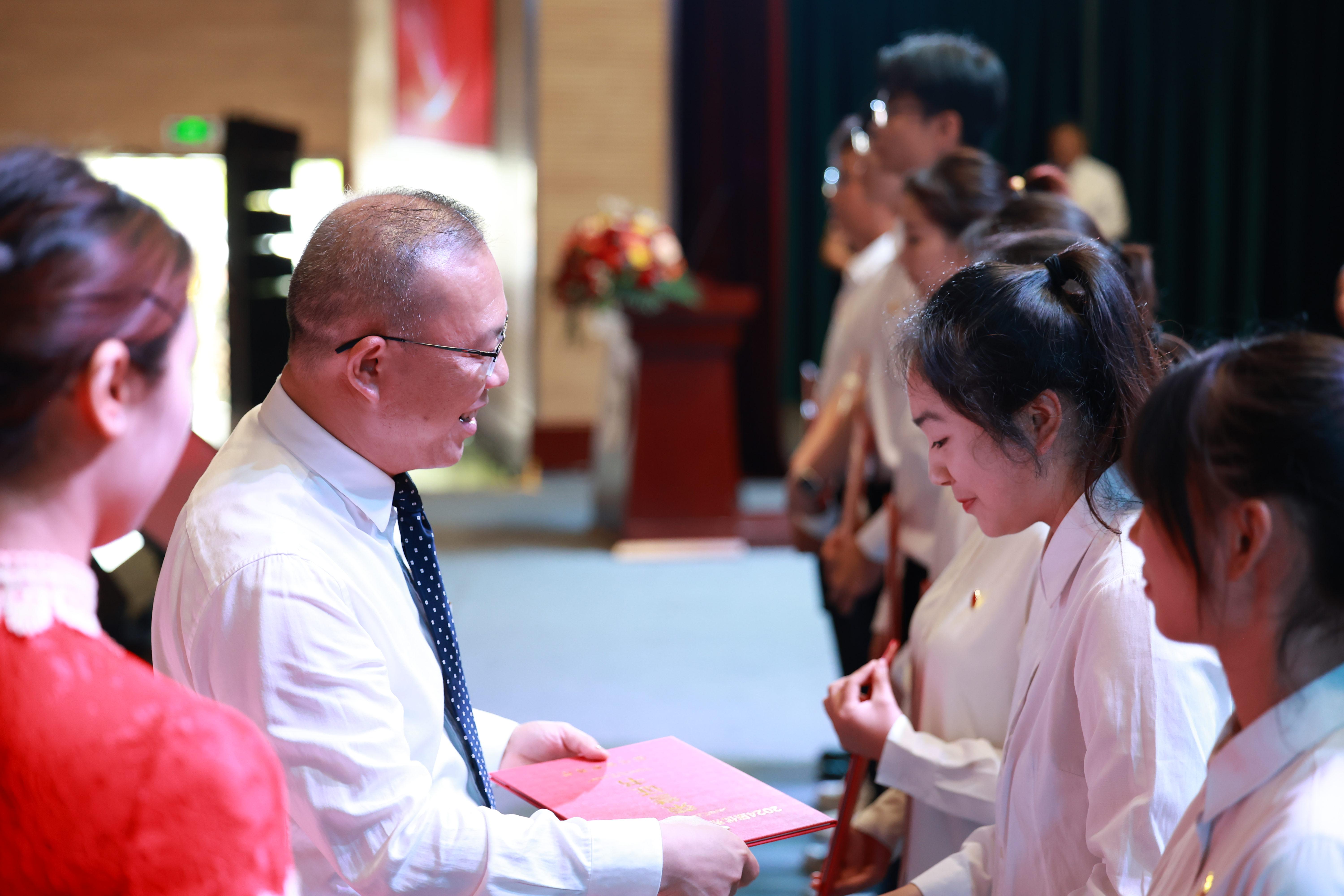 副校长黄恩兴宣读了优秀毕业生表彰决定。校长赖芳为2024届毕业生代表颁发毕业证书,党委书记贺兆轩、副校长黄勇分别为省级优秀毕业生代表、校级优秀毕业生代表颁发荣誉证书。