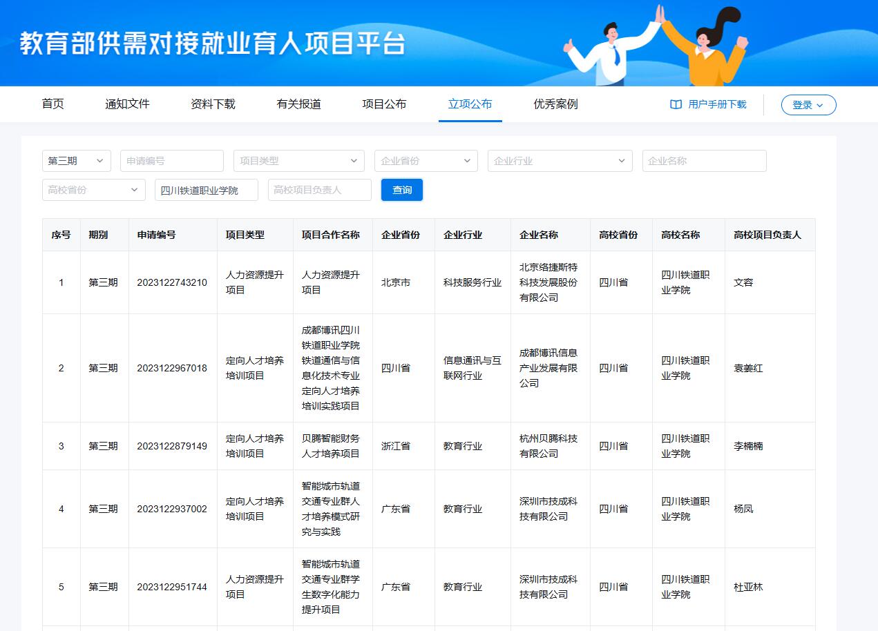 近日,教育部公布了第三期供需对接就业育人项目立项名单(教就业司函〔2024〕(23)号),学校获批立项9个,项目涵盖定向人才培养培训、就业实习基地、人力资源提升三个类别。项目涉及北京络捷斯特科技发展股份有限公司、四川京邦达物流科技有限公司、杭州贝腾科技有限公司、厦门网中网软件有限公司等多家企业。