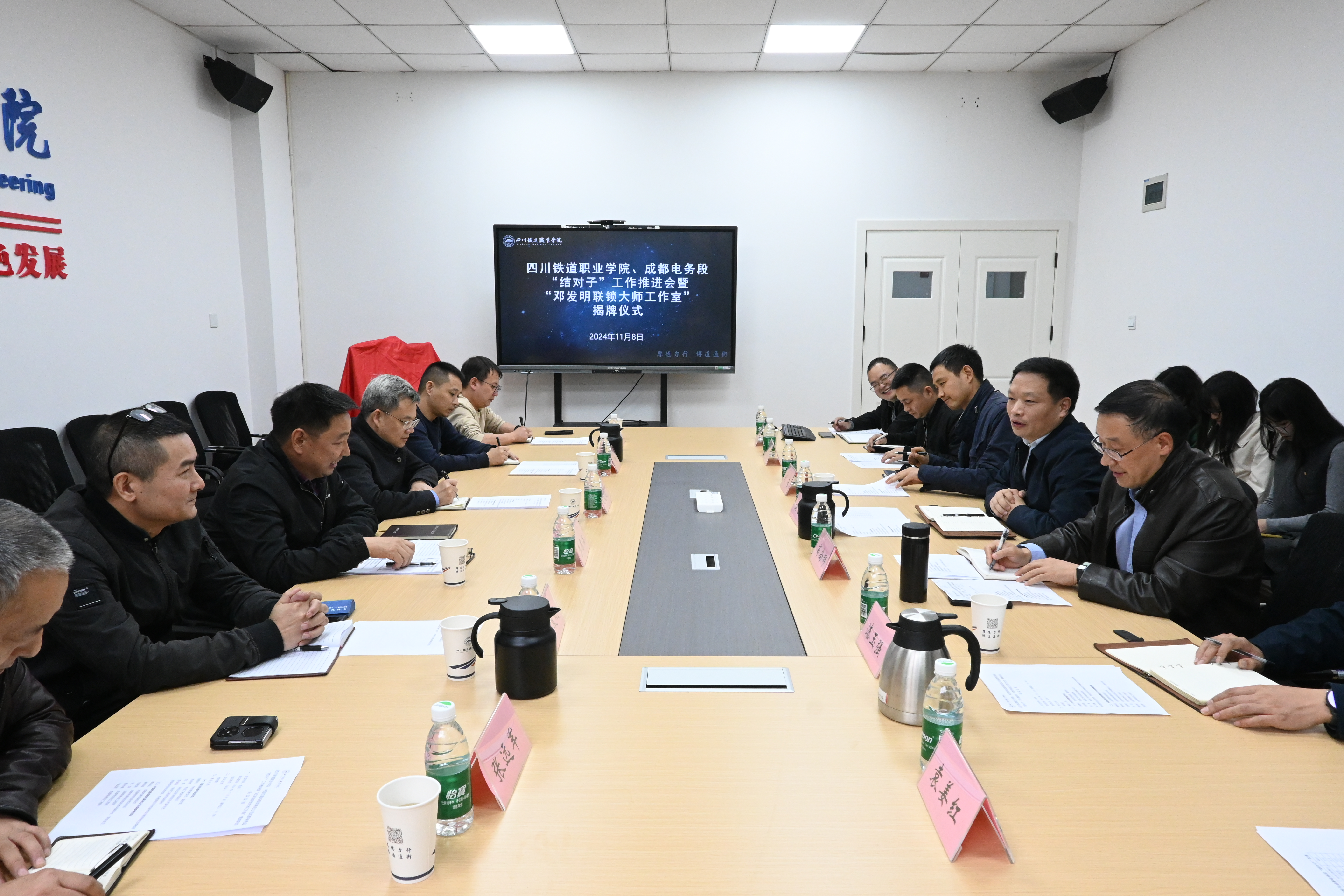 11月8日,学校与成都电务段“结对子”工作推进会暨“邓发明联锁大师工作室”揭牌仪式在电信工程学院举行。成都电务段副段长李恩品、职教科科长曾尚斌、信息技术科副科长(联锁主任)邓发明等相关人员,副校长黄恩兴、电信工程学院班子成员及相关教师代表出席会议。 黄恩兴对李恩品一行的到来表示热烈欢迎,他介绍了学校的办学历史、专业特色、人才培养、校企合作等情况。他指出,学校与成都电务段“结对子”合作,是双方实现优势互补、资源共享的重要举措。李恩品就学校长期以来为企业培养输送大批优秀人才表示感谢。他表示,企业高度重视校企合作,希望以点带面把合作进一步做深做实,推动校企合作取得更大成果。双方围绕人才培养模式、课程体系建设、实习实训基地建设等方面展开了深入讨论。双方一致表示,将进一步深化专业技术人才培养与产业需求的精准对接,提升人才的行业适应性。