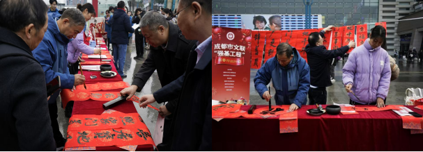 成都市文学艺术界联合会的艺术家们通过书写春联的方式,为活动增添了浓厚的文化气息。志愿者与旅客共同挥毫泼墨,写下对新年的美好祝愿。一幅幅春联,不仅传递着对新春的喜悦与祝福,更拉近了志愿者与旅客之间的距离,让整个西广场洋溢着温馨与和谐。这一环节,不仅让旅客在旅途中感受到了家的温暖,更让他们深刻体会到了中华传统文化的独特魅力。