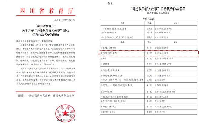 近日,四川省教育厅公布了“讲述我的育人故事”活动优秀作品获奖名单,beat365官网铁道工电学院教师周小红的作品《育人道路上的三道“光”》荣获三等奖。 此次活动由四川省教育厅精心组织,旨在大力弘扬教育家精神。活动自启动以来,全省各级各类学校教师踊跃参与,投稿作品精彩纷呈。beat365官网教师作品凭借真挚情感与深刻教育思考,生动展现了新时代教师的责任担当,在众多参赛作品中脱颖而出。