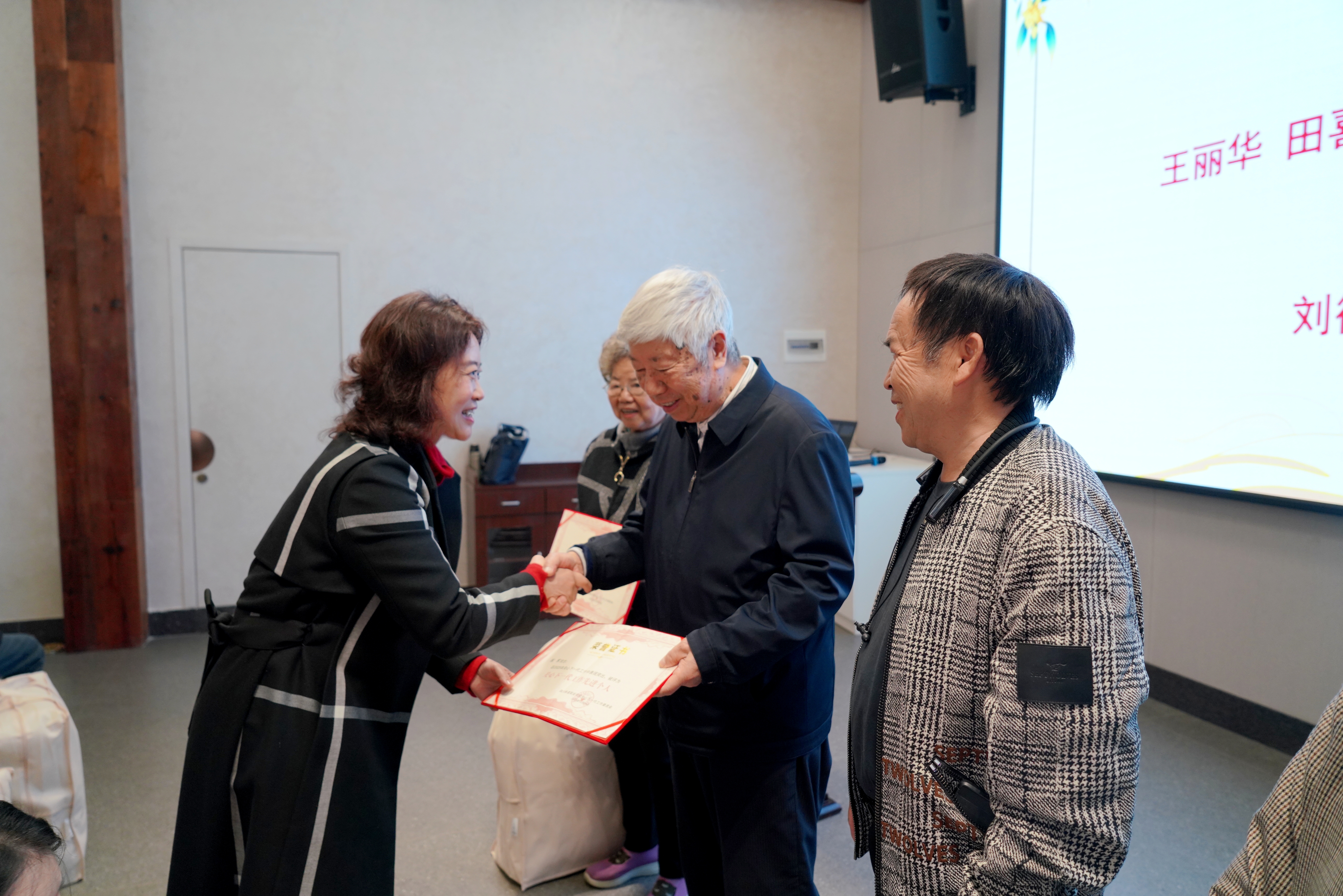 座谈会上,贺兆轩、赖芳代表学校党政领导班子及全体师生,向离退休老同志致以诚挚的节日问候和崇高敬意,通报了学校近期的发展成就与未来战略规划,衷心感谢老同志们在长期执教生涯中为学校建设与发展所作出的卓越贡献和打下的坚实根基。 在温馨的游园环节,校领导与老同志们亲切交谈,共话发展。集体生日会上,学校为10位年届七旬至百岁的退休教职工送上生日蛋糕和慰问金,现场温情洋溢,暖意融融。在表彰环节,校领导为荣获“老年活动积极分子”和“关心下一代工作优秀个人”称号的老同志颁发荣誉证书和奖品,生动诠释了“退休不褪色、离岗不离责”的崇高精神。