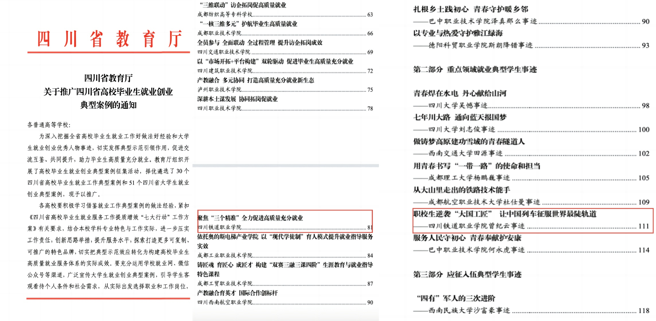近日,四川省教育厅编制发布了《2025年四川省高校毕业生就业工作典型案例》集,学校提交的聚焦“三个精准”全力促进高质量充分就业典型工作案例和优秀校友中车工匠曾纪云在国家重点领域就业事迹案例成功入选,成为全省高校就业创业工作的示范标杆,彰显了学校深耕职业教育、赋能学子成长的显著成效。