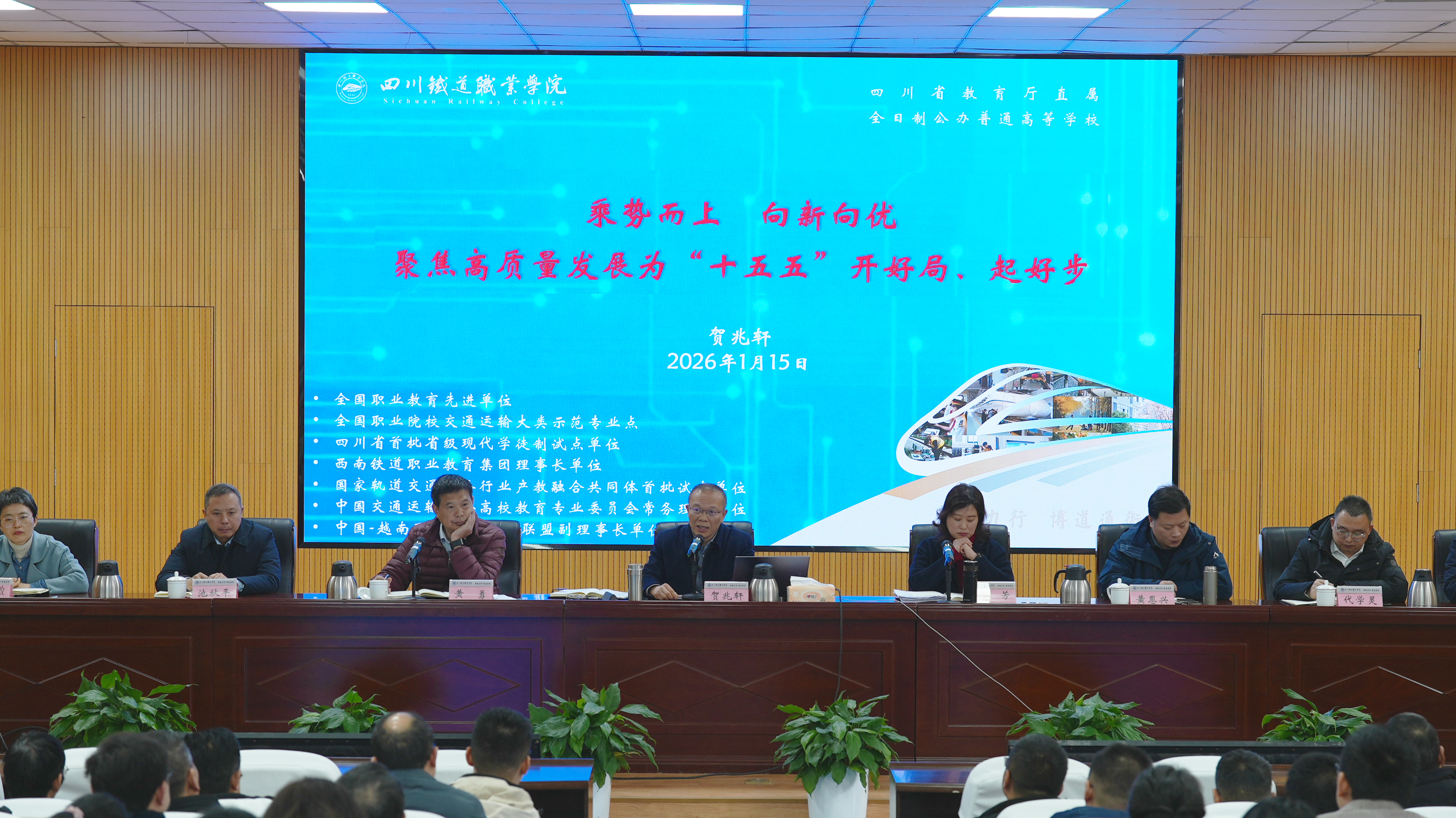 会上,机车车辆学院、城市轨道交通学院、铁道工电学院、电信工程学院、经济管理学院、人工智能工程学院、马克思主义学院、公共教学部及内江校区管委会等9个教学单位负责人依次汇报了本单位2025年工作进展与亮点,并就2026年工作思路与重点举措作了交流。 纪委书记池秋平围绕强化政治监督,回顾了一年来学校纪委在深化系统整治、开展专项监督、一体推进“不敢腐、不能腐、不想腐”机制建设以及加强纪检队伍自身建设等方面取得的成效。结合学习贯彻二十届中央纪委五次全会精神,他对2026年重点工作作出部署,强调要推动监督常态长效化,精准防控重点领域廉洁风险,持续营造风清气正的政治生态。 校长赖芳以《筑牢基本盘、抓住新机遇、创造新未来》为题作专题报告。她从党建引领、人才培养、产教融合、“五金”建设、内部治理等方面,全面梳理了学校2025年取得的主要成绩。同时,对标“双高计划”建设目标,她深刻剖析了当前在标志性成果培育、干部与师资队伍建设、绩效考核评价机制等方面存在的短板与不足。赖芳强调,2026年要抢抓战略机遇,坚定信心、迎难而上,在巩固既有优势基础上积极开拓新路径,重点聚焦深化改革、现代治理能力提升和高水平对外开放,奋力推动学校事业再上新台阶。 党委书记贺兆轩充分肯定了2025年全校上下团结奋进所取得的扎实成效。他指出,面对新质生产力加速演进、新一轮“升本潮”带来的激烈竞争以及自身发展中的瓶颈问题,全校上下必须增强推动高质量发展的紧迫感、危机感、责任感和使命感。他强调,要深刻把握大局大势,主动适应高质、新质发展要求;要夯实基础、拓展格局,全力冲刺“新双高”建设和职教本科创建目标;要系统推进教学、科研、职称评聘、绩效分配、二级管理等深层次改革,充分释放发展潜能;要着力加强干部队伍建设,全面提升政治能力、战略谋划能力、执行落实能力和协同作战能力;要统筹发展与安全,坚决守牢政治安全、校园安全和廉洁自律底线。他要求,要把改革创新的“势能”、因地制宜的“特色”、投资于人的“效能”切实转化为推动高质量发展的“实效”,奋力书写学校新时代高质量发展的崭新篇章!