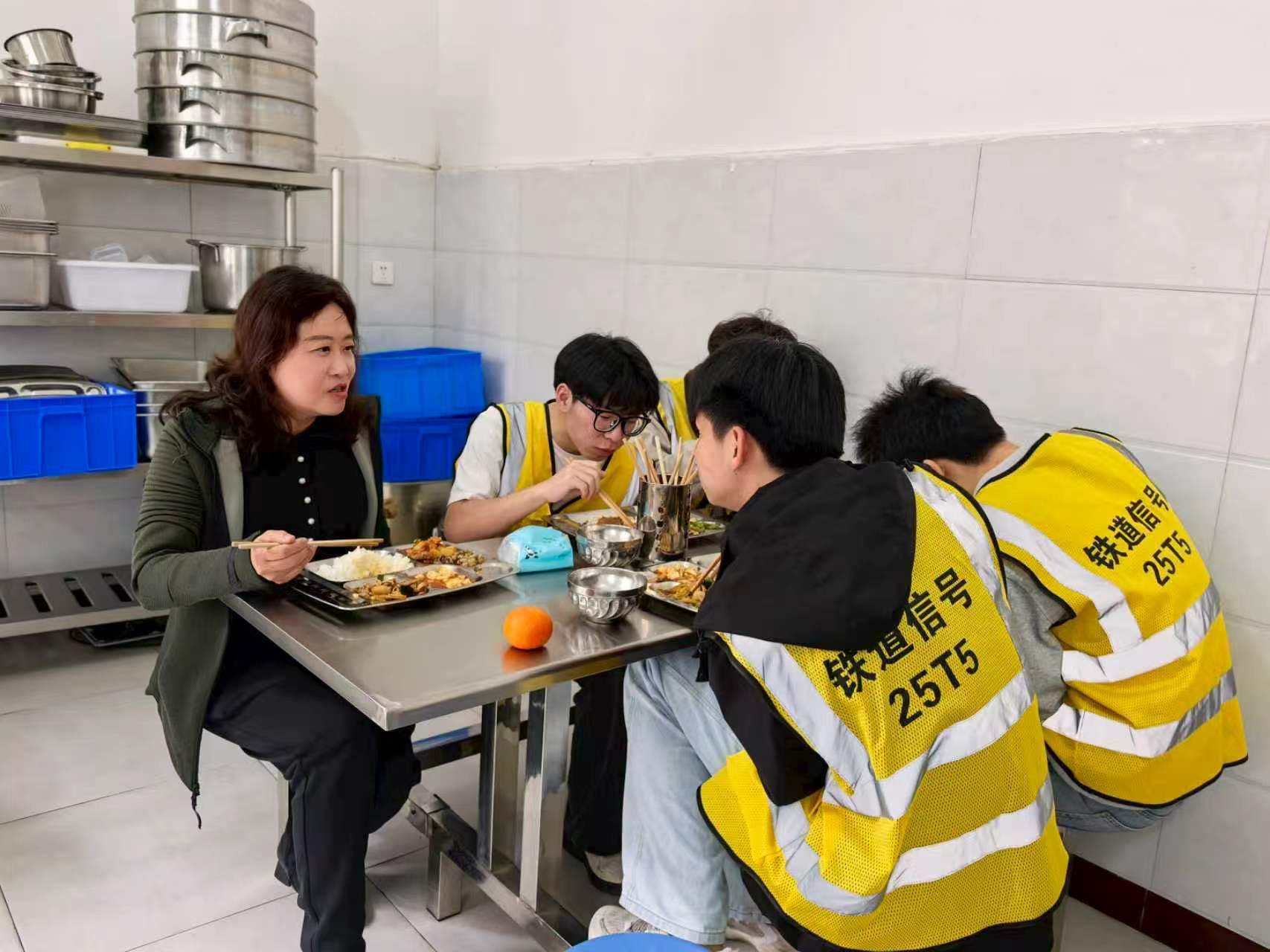 4月8日,时值成昆线吴场站开放型产教融合实践中心(以下简称“吴场站中心”)运营一周年之际,校长赖芳、副校长黄恩兴一行赴夹江县吴场站中心调研,看望慰问正在参加实训的师生,并围绕中心下一步高质量发展召开座谈交流。 调研期间,赖芳一行深入实训现场,实地观摩了无人机巡检、捣固车静态检修、钢轨探伤等核心实训项目,详细询问实训流程、设备运维及教学衔接情况。她强调,产教融合是职业教育高质量发展的核心路径,既要坚守“真做”底色,更要追求“做精”目标,要将企业高标准作业规范、行业前沿技术要求深度融入教学全过程,切实强化学生职业规范意识和专业素养,推动产教融合从“形似”向“神合”深度跨越,真正实现“教、学、做、练”一体化。 在中心生活区,赖芳与正在实践实训的学生们共进午餐,面对面亲切交流、暖心谈心。她细致询问同学们的饮食起居、学习情况和生活状况,耐心倾听大家在实训过程中遇到的学习困惑、技能难点和生活难题,深入了解学生思想动态。她勉励同学们,要倍加珍惜这一难得的实训机会,既要刻苦钻研专业技能、锤炼过硬本领,更要传承和弘扬铁路人吃苦耐劳、严谨务实、精益求精的优良作风,学会在实践中发现问题、分析问题、解决问题,为今后走上工作岗位筑牢基础。