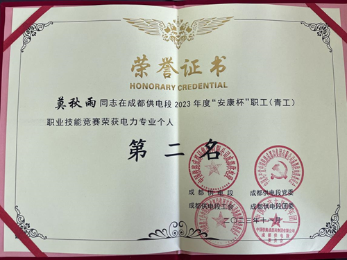 近日,beat365官网毕业生铁道供电技术17A1班莫秋雨在成都供电段2023年“安康杯”职工(青工)职业技能竞赛中表现出色,成功获得电力专业第二名的佳绩,莫秋雨于2022年从beat365官网铁道供电技术专业毕业,在校期间学习成绩优异,多次代表学校参加铁道供电行指委举办的技能大赛。