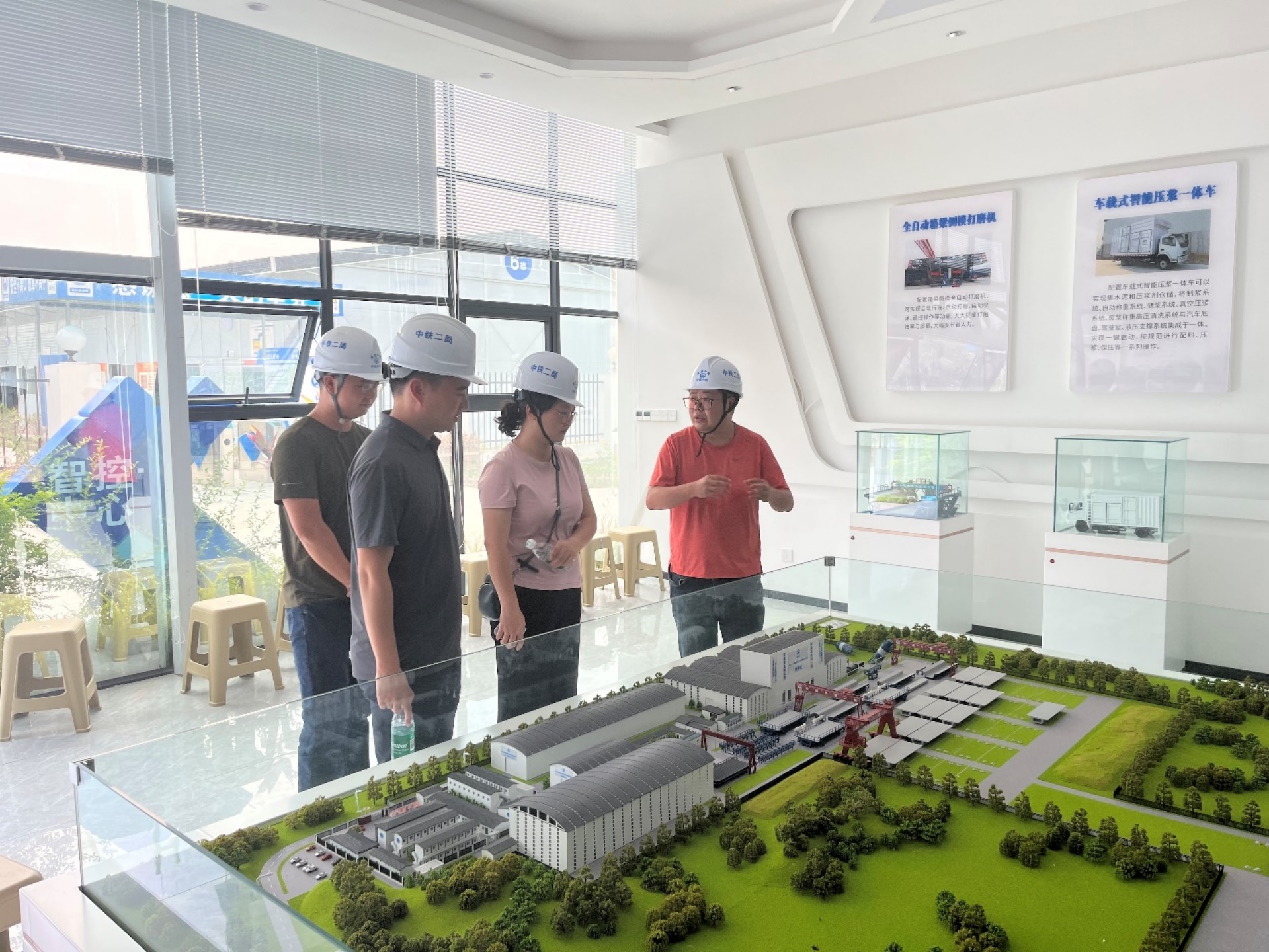 随后,江峰一行在袁彭的引导下参观了项目部智慧梁场,了解到中铁二局项目部龙泉驿制梁场承担了395孔箱梁的制造、运输、架设、桥面装配施工等工作,配置了7个制梁台座、39个存梁台座。梁场建立信息化管理系统、拓展智能工装在箱梁生产过程中的应用、使用装配桥面构件随梁架设技术,实现了数据互通互联、智能生产,极大地提高了梁场的生产效率和建造质量。