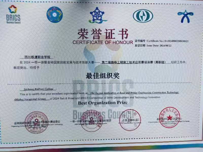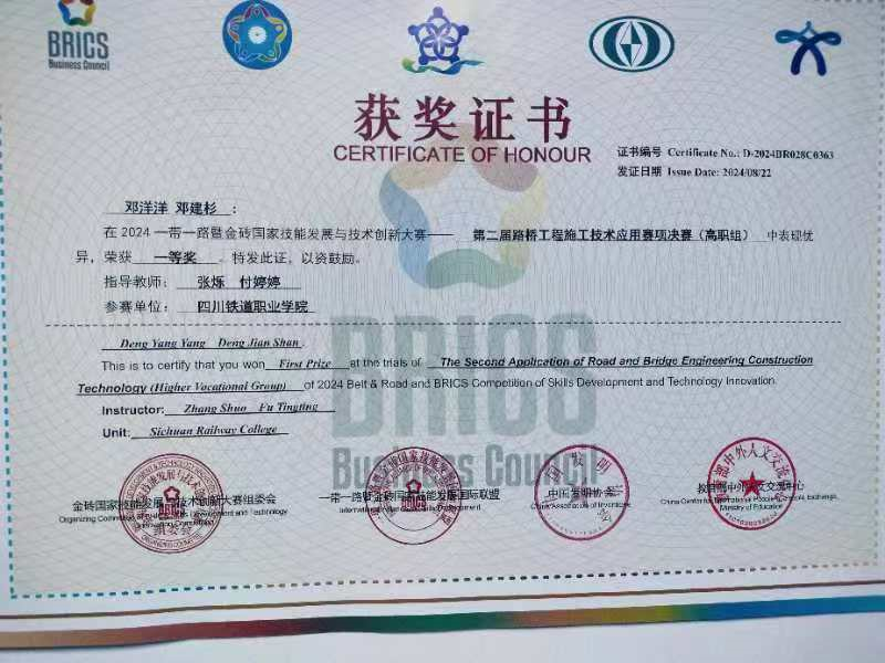 beat365官网铁道工电学院师生在此次大赛中表现出色,取得了优异的成绩。铁道工程技术专业22T3班邓洋洋和23T2班邓建杉凭借扎实的专业技能和出色的团队协作能力荣获学生组一等奖。同时,beat365英国官方网站荣获最佳组织奖,指导教师获得优秀指导教师奖。