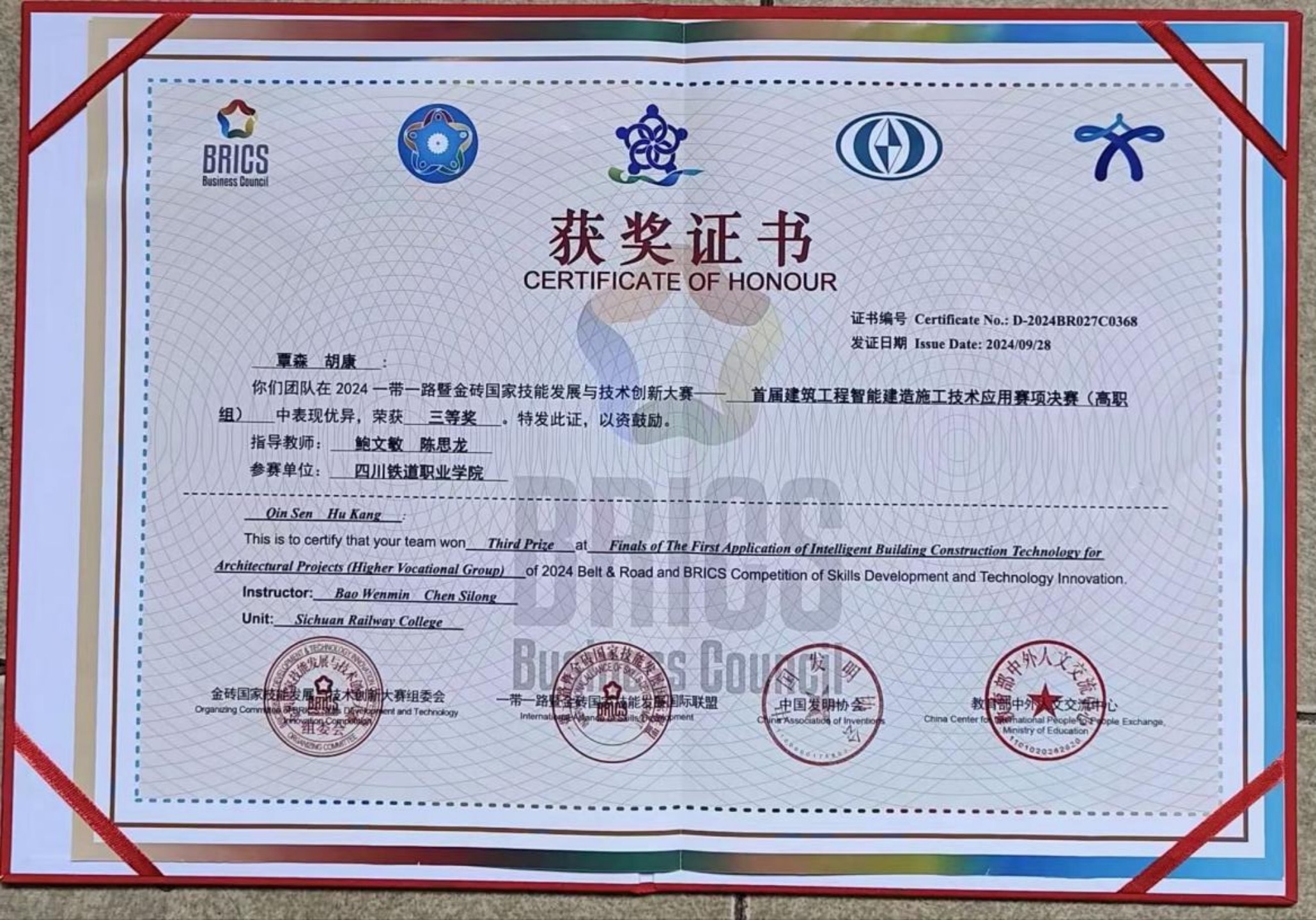 经过一整天紧张激烈的比拼,beat365官网铁道工程技术22T的覃森和胡康两位学子,凭借前期的辛勤付出与卓越的团队合作,获得全国总决赛三等奖。