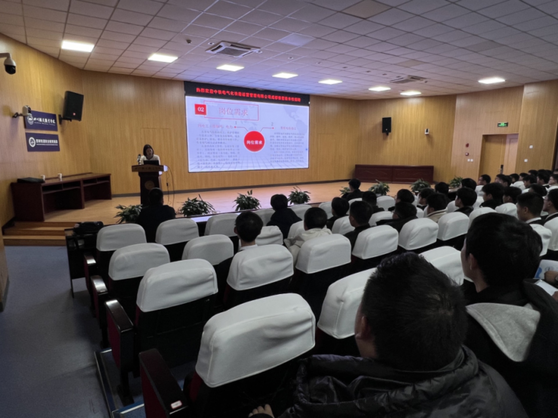 本次宣讲会在学术报告厅开展,由成都维管段劳科科长赵海潮、办公室副主任夏璞主持。宣讲会前,公司播放了宣传片,让学生对公司的组成、运营管理等有一个初步的了解。宣讲会上,夏副主任围绕公司的成立、承接的站段、岗位的需求、工作地点、工作及生活环境、工休形式、薪资待遇等方面做了详细的介绍。宣讲会后,招聘负责人围绕参会同学对公司提出的问题做出具体的解答,随后开展面试环节。