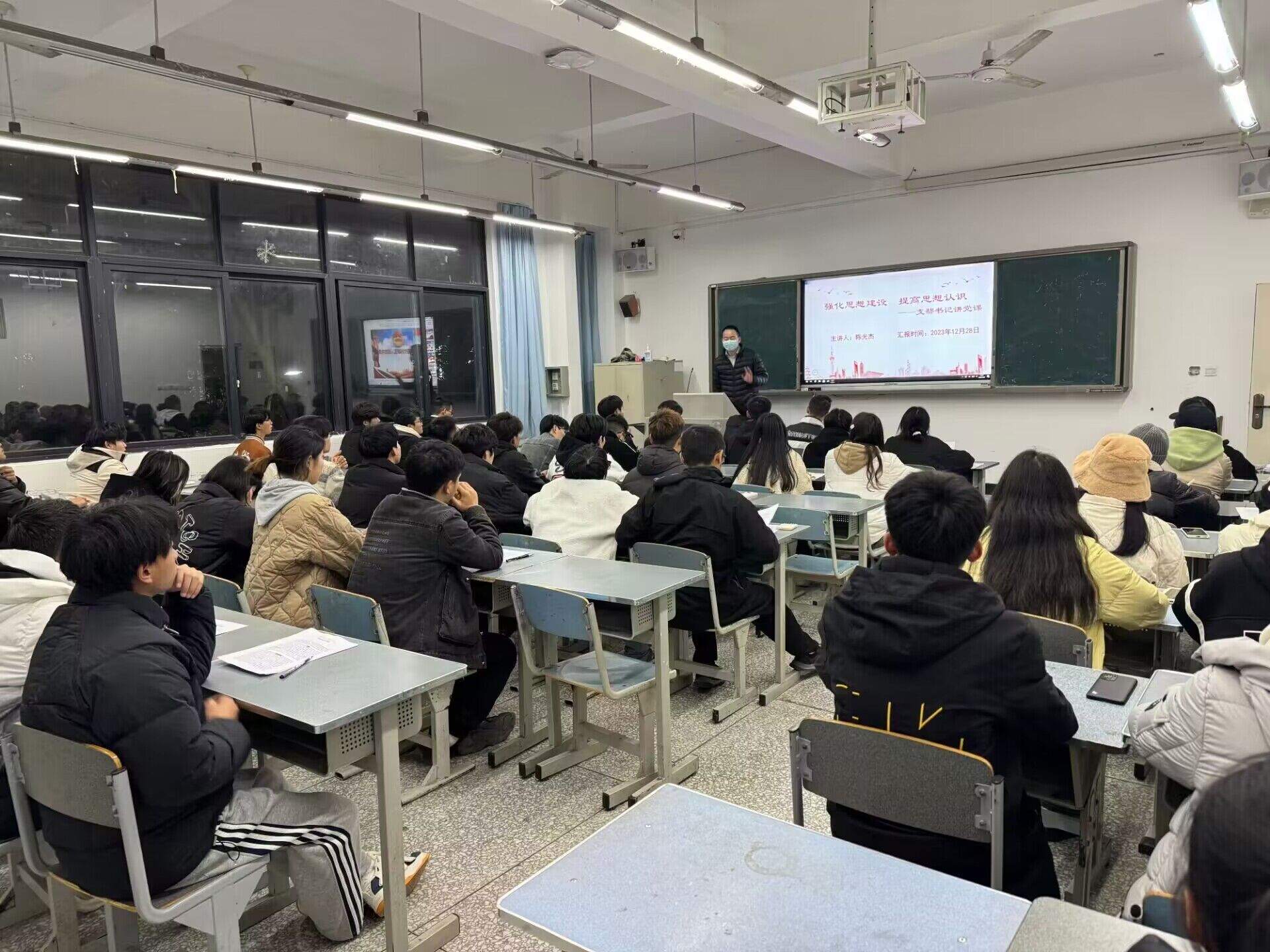 习近平总书记强调:中国的未来属于青年,中华民族的未来也属于青年。青年一代的理想信念、精神状态、综合素质,是一个国家发展活力的重要体现,也是一个国家核心竞争力的重要因素。2023年12月28日,学生工作党支部书记陈光杰在2206教室为学生党员、入党积极分子讲授专题党课。