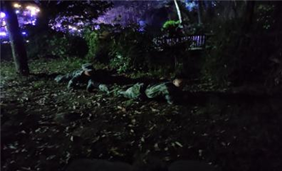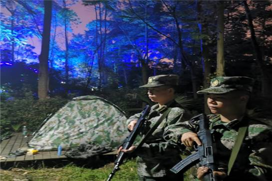 18:30战术队跑步到达指定宿营区和进行晚餐后,开展“传红色经典·忆革命先烈”诗歌朗诵活动、搭建帐篷、分享红军前进中的故事、进行模拟反恐活动及抢帽子游戏和执行夜间轮流值守等。