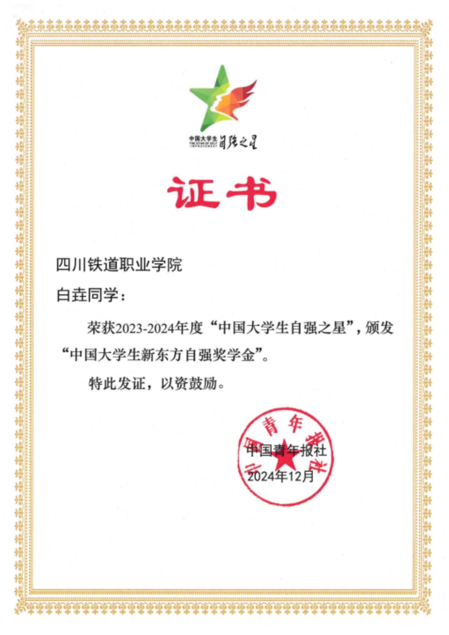 近日,由共青团中央、全国学联指导,中国青年报社、新东方教育科技集团、中国青年创业就业基金会联合举办的2023-2024年度“中国大学生自强之星”奖学金评选结果揭晓,beat365官网2021级铁道工程技术专业白垚同学荣获2023—2024年度“中国大学生自强之星”称号。