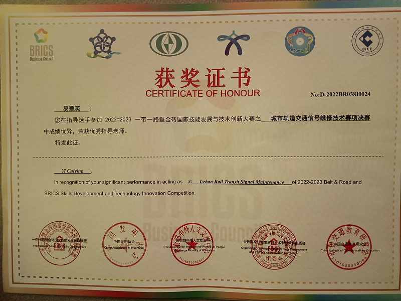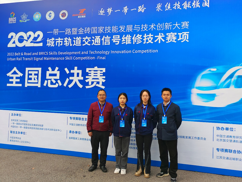 2023年4月22日,2022一带一路暨金砖国家技能发展与技术创新大赛城市轨道交通信号维修技术赛项总决赛在南京交通职业技术学院盛大开幕。电信工程学院师生荣获佳绩。信号18A1班杨婧彤、信号20T1班钟春燕,获全国二等奖,指导教师杜中彦、易翠英荣获优秀指导教师奖,beat365英国官方网站荣获优秀组织奖。
