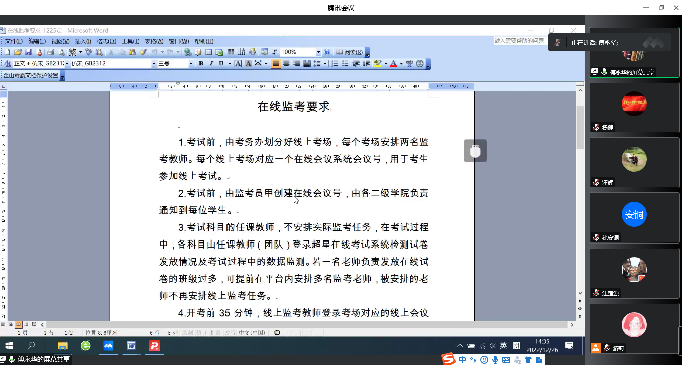 公教部副主任傅永华组织部门教师学习了期末考试在线监控要求、线上考试工作流程、线上考试考场规则、线上考试模拟演练中存在的问题及解决方案等内容。副主任傅永华指出,监考教师要明确期末线上考场的任务职责和工作要求,认真履行在线监考责任,全程视频监控学生的考试,及时处理考试中出现的问题。监考教师要熟悉线上考试工作流程,清楚各个时间节点的工作内容,引导学生做好设备调试工作、诚信答题、规范交卷等考试工作,遵守期末线上考试全过程的相关要求。他强调,针对线上考试模拟演练中存在的问题及解决方案,监考教师要明确监考工作要求,熟悉考试流程;提醒学生遵守线上考试纪律,配合监考教师查验身份证等证件,要求学生知晓考试入场时间、正式答题时间、考试场次、会议号、考场环境、考试平台卡顿处理方法等要求,认真做好期末考试工作。