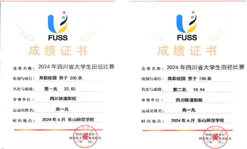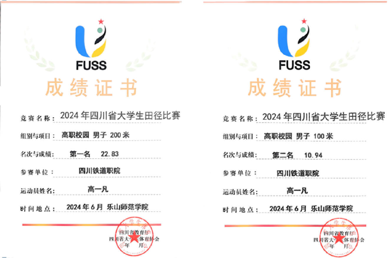 6月11日至6月15日,由四川省教育厅主办,四川省大学生体育协会执行、乐山师范学院承办的2024年四川省大学生田径比赛在乐山市体育中心举行。beat365官网代表队成绩斐然,铁道机车22T1班高一凡同学在高职校园组男子200米决赛中勇夺第一名、斩获100米决赛第二名。