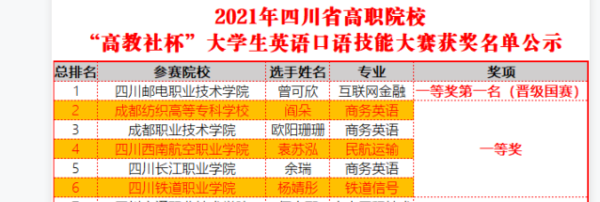 由四川省教育厅主办的2021年四川省高职院校“高教社杯”大学生英语口语技能大赛于2021年4月28日和29日在成都纺织高等专科学校北苑校区举行。经过紧张的三轮角逐,我院参赛选手杨婧彤同学以综合排名第六的优异成绩斩获一等奖。