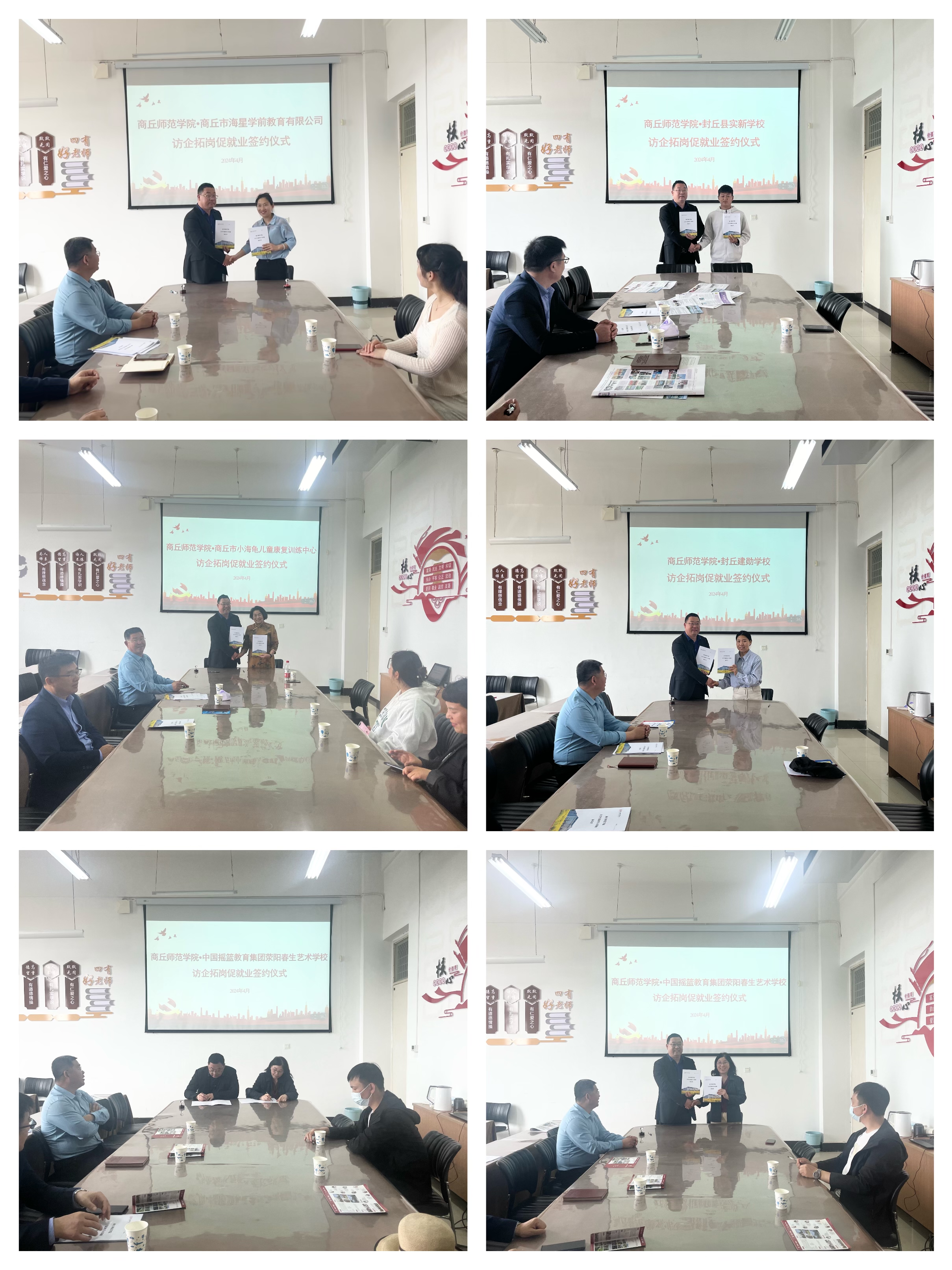 4月13日,BB贝博艾弗森官方网站以商丘师范学院2024届毕业生春季双向选择洽谈会为契机,于汉梁楼203会议室开展访企拓岗促就业专项行动。学院邀请商丘市海星学前教育有限公司、封丘县建勋学校、封丘县实新学校、商丘市小海龟儿童康复训练中心、中国摇篮教育集团荥阳春生艺术学校五家单位来贝博官网商谈毕业生实习就业校企合作项目,学院院长孙旭、党委副书记邱友谊、副院长李战营、毕业班辅导员张旖旎以及五家单位相关负责人参加签约仪式。