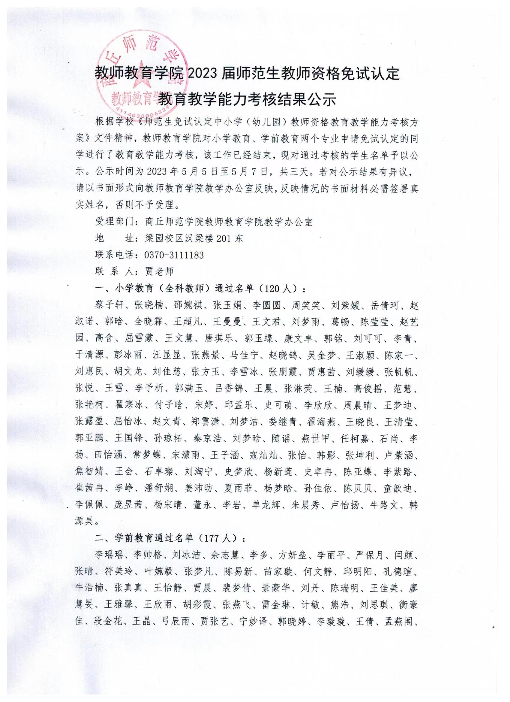 BB贝博艾弗森官方网站2023届师范生教师资格免试认定教育教学能力考核结果公示
