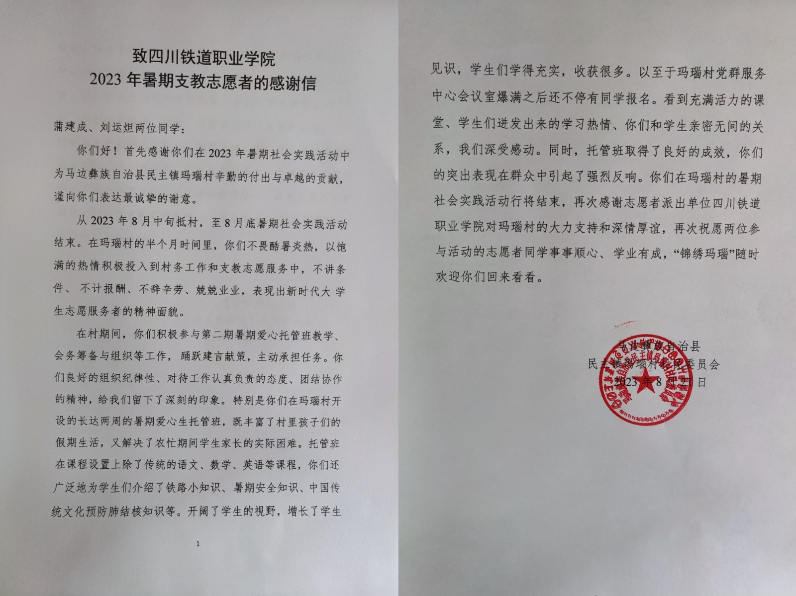 8月27日,机车车辆学院收到来自马边彝族自治县民主镇玛瑙村村民委员会向学院学子发来的感谢信。信中赞扬了我院21级蒲建成同学在志愿服务期间严守纪律、吃苦耐劳、兢兢业业,彰显出新时代大学生的良好精神风貌。