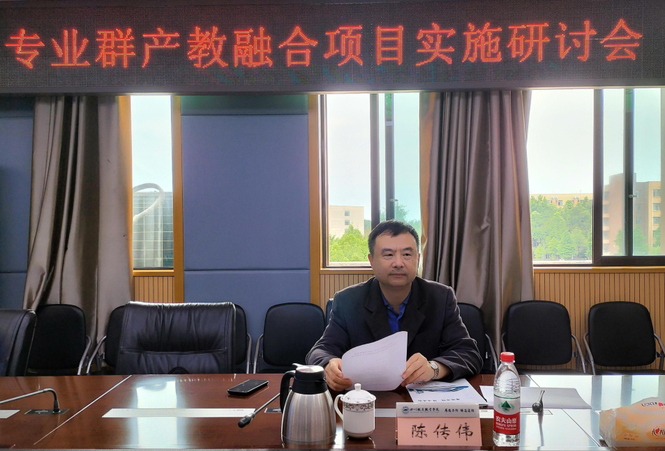 5月26日下午,beat365英国官方网站在第五会议室召开专业群产教融合项目实施研讨会,并邀请了成都工业学院副校长陈传伟为学校专业群产教融合项目实施策略做指导。教务处处长陈风玲和各二级学院负责人参加了会议,会议由教学副校长刘昊君主持。