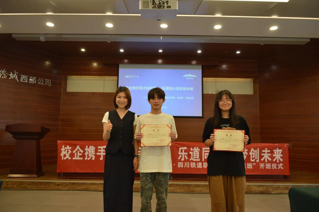 在现场热烈的氛围中,成都欢乐谷游客服务部总监耿小丽为 “乐道” 班班长颁发聘书。新任班长刘语君同学进行表态发言,承诺将带领班级同学积极投入实践学习,不负学院与企业的期望。随后,校企双方代表为 “乐道” 班实践教学基地、人才培养基地揭牌。仪式结束后,“乐道” 班全体学员参与了首次企业文化课程学习,实地参观园区并开展岗位体验活动,沉浸式感受成都欢乐谷的运营模式与工作氛围。