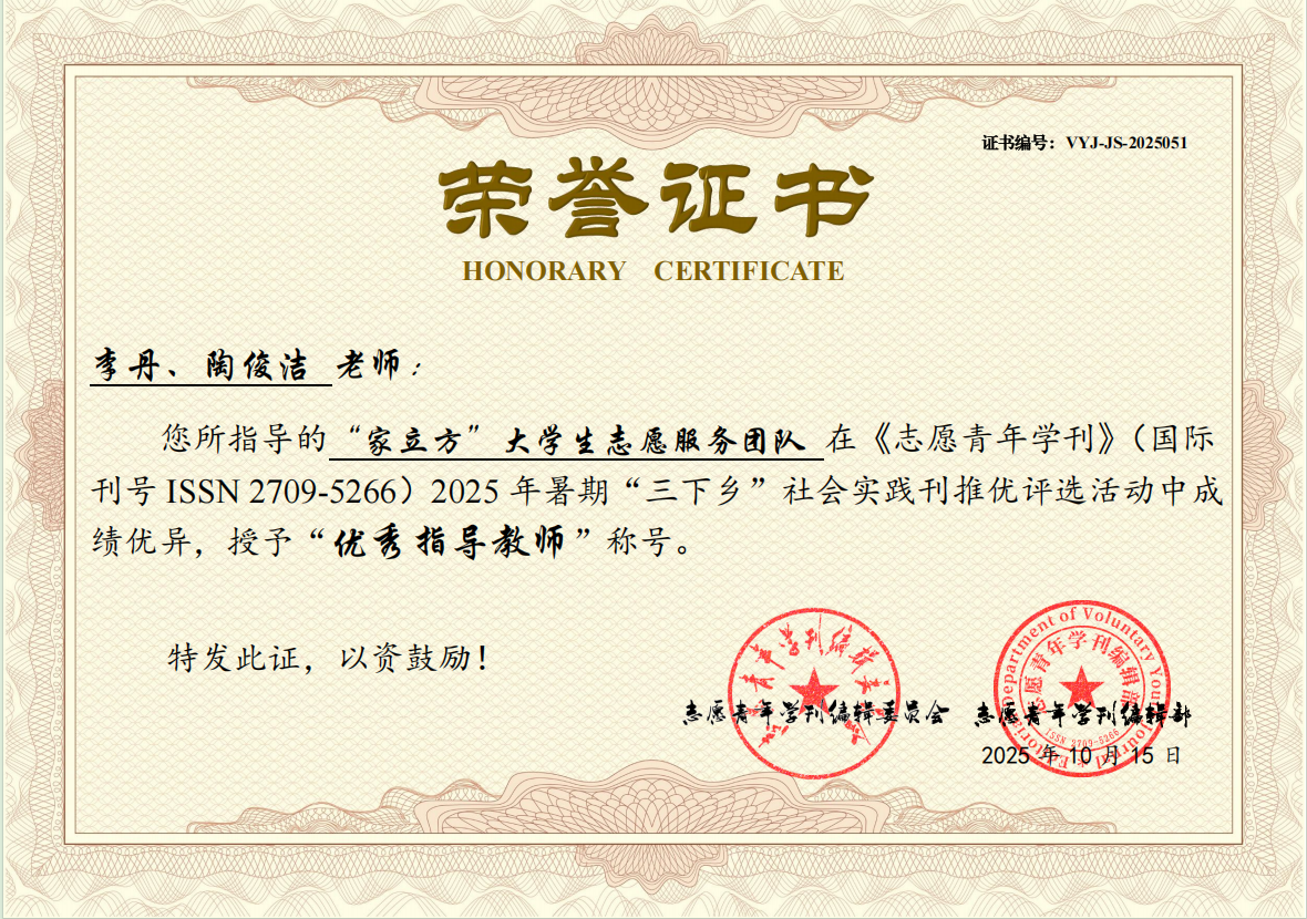 近日,经济管理学院“家立方”大学生志愿服务团队撰写的实践纪实作品《青春力量深耕社区,实践赋能基层治理》被《志愿青年学刊》(国际刊号ISSN 2709-5266)正式录用刊发。同时,在该刊物主办的2025年暑期“三下乡”社会实践刊推优评选中,该作品荣获“活动纪实类三等奖”。团队指导教师李丹、陶俊洁荣获“优秀指导教师”称号。
