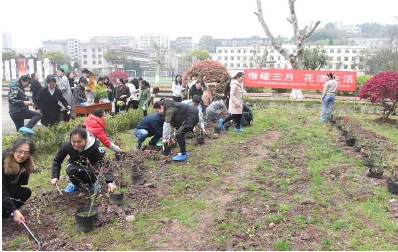 为进一步提高全校教师爱护环境和绿化意识,继续发扬艰苦奋斗的精神,在2021年“三八”妇女节到来之际,内江校区工会组织全体女职工及部分男职工在办公楼旁开展了植树活动。