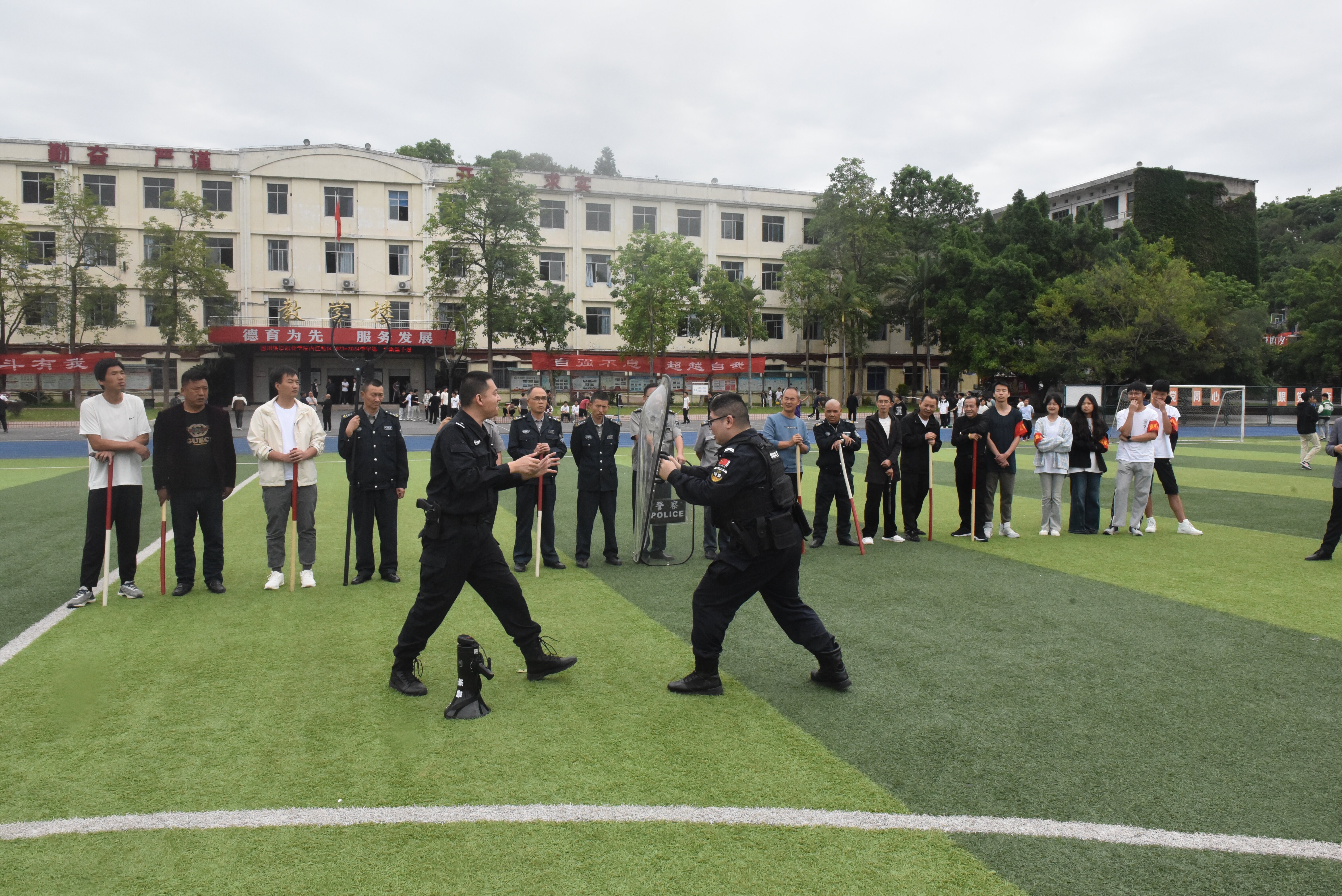 “纸上得来终觉浅,绝知此事要躬行。”在培训结束后,内江校区立即组织了一场实战反恐防暴演练。演练中,模拟了恐怖分子闯入校园,并在足球场砍伤1名学生,师生们迅速启动应急预案,按照预案要求,展开了一系列紧急应对措施。安保人员迅速反应,使用一键报警器报警并通知值班人员。值班人员迅速组织防暴队员手持防暴器材追逐“暴徒”,学生们在老师的引导下,有序撤离到安全区域,随即特警到场制服并控制歹徒;医疗救护人员及时对受伤学生进行救治。整个演练过程紧张有序、有条不紊,充分展示了师生们应对突发事件的快速反应能力和团队协作能力。