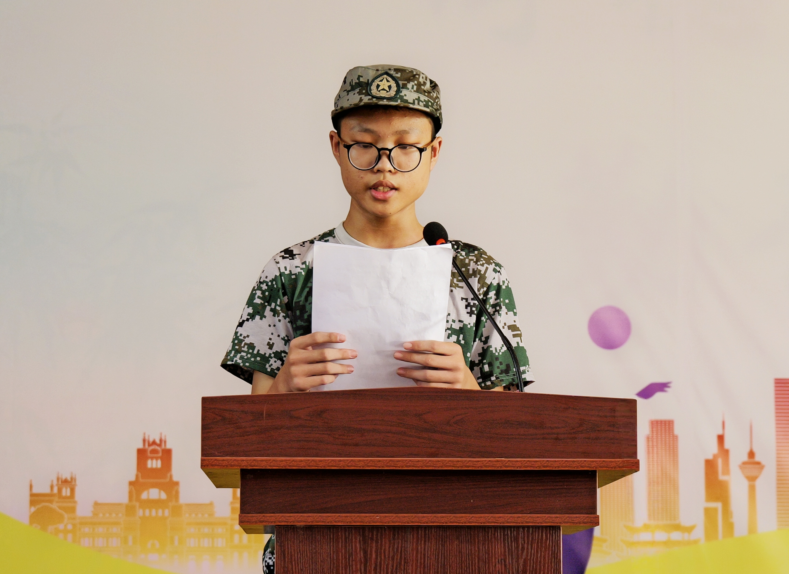 军训教官邱志鑫代表全体教官发言。他希望全体参训同学要充分认识到军训的重要意义,以高标准、严要求对待训练。同时,希望全体同学努力做到端正态度、遵守纪律、不怕困难、团结协作圆满完成军训任务。